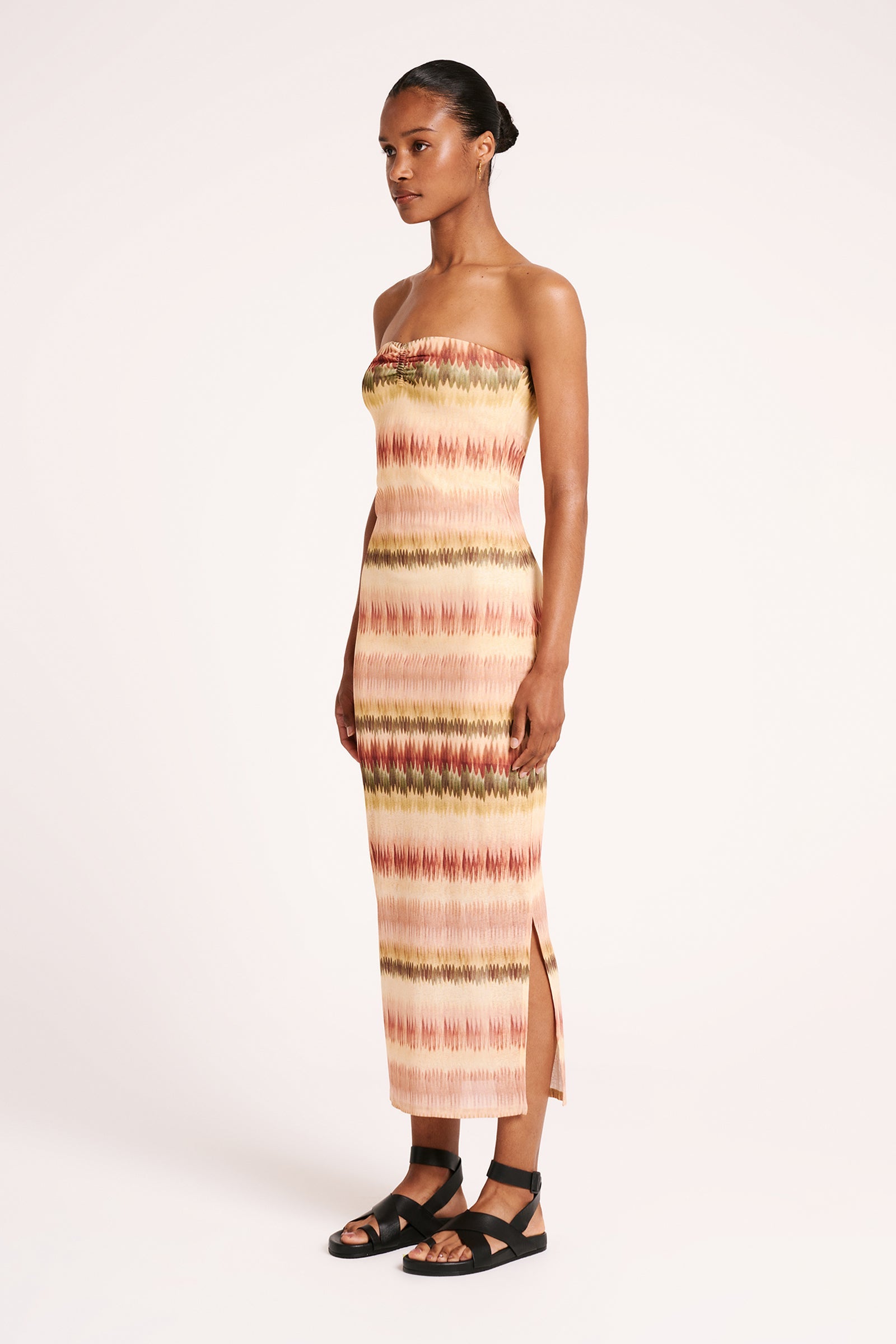 The Akira Strapless Dress is made from stretch jersey in our exclusive Calypso print. The silhouette is fitted with length finishing above the ankles. Features include elastic ruching detail at centre front, encased elastic around top edge for ease of wear and side seam split. This garment is fully lined.