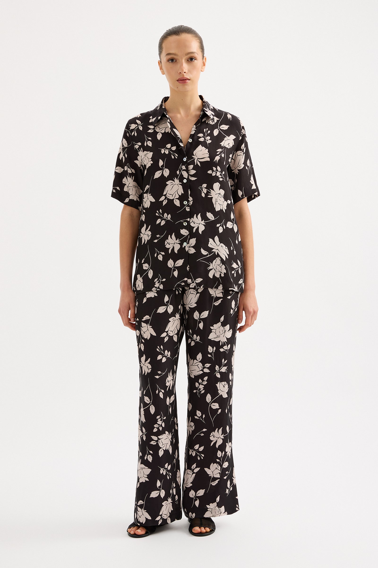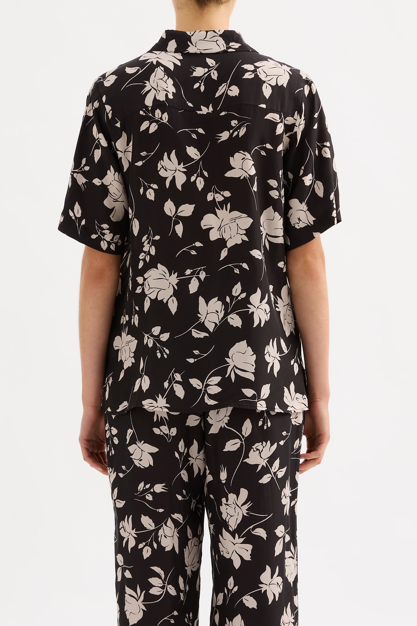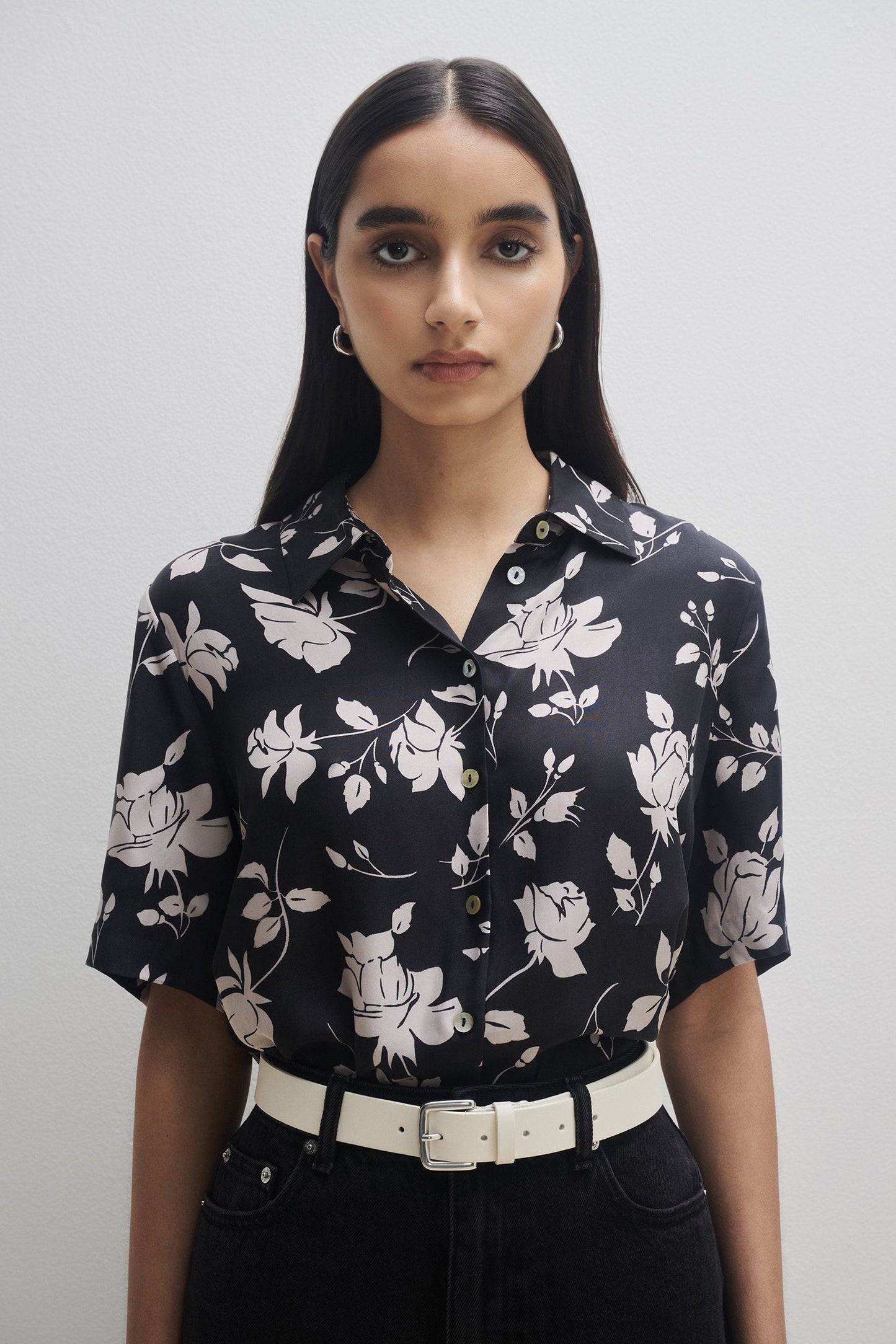 The Alba Cupro Shirt is made in our signature cupro fabrication in our exclusive Alba print. The silhouette is an oversized fit, with length finishing at the hip. Features include classic shirting details with back yoke and shell buttons.
