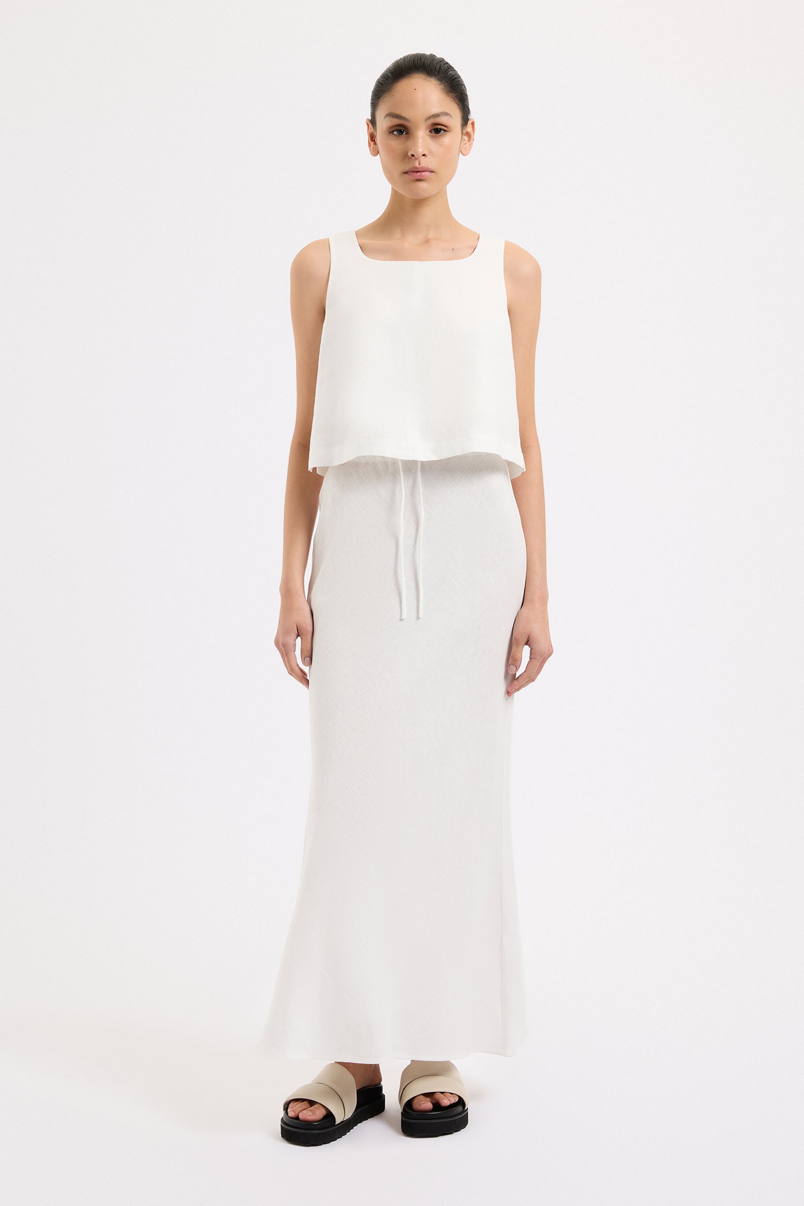 The Amani Linen Skirt in white is made from a premium linen which has been washed for a smooth, soft hand feel. Cut on the bias, this silhouette finishes just above the ankles. Features include encased elasticated waistband with a self cut draw string at centre front.