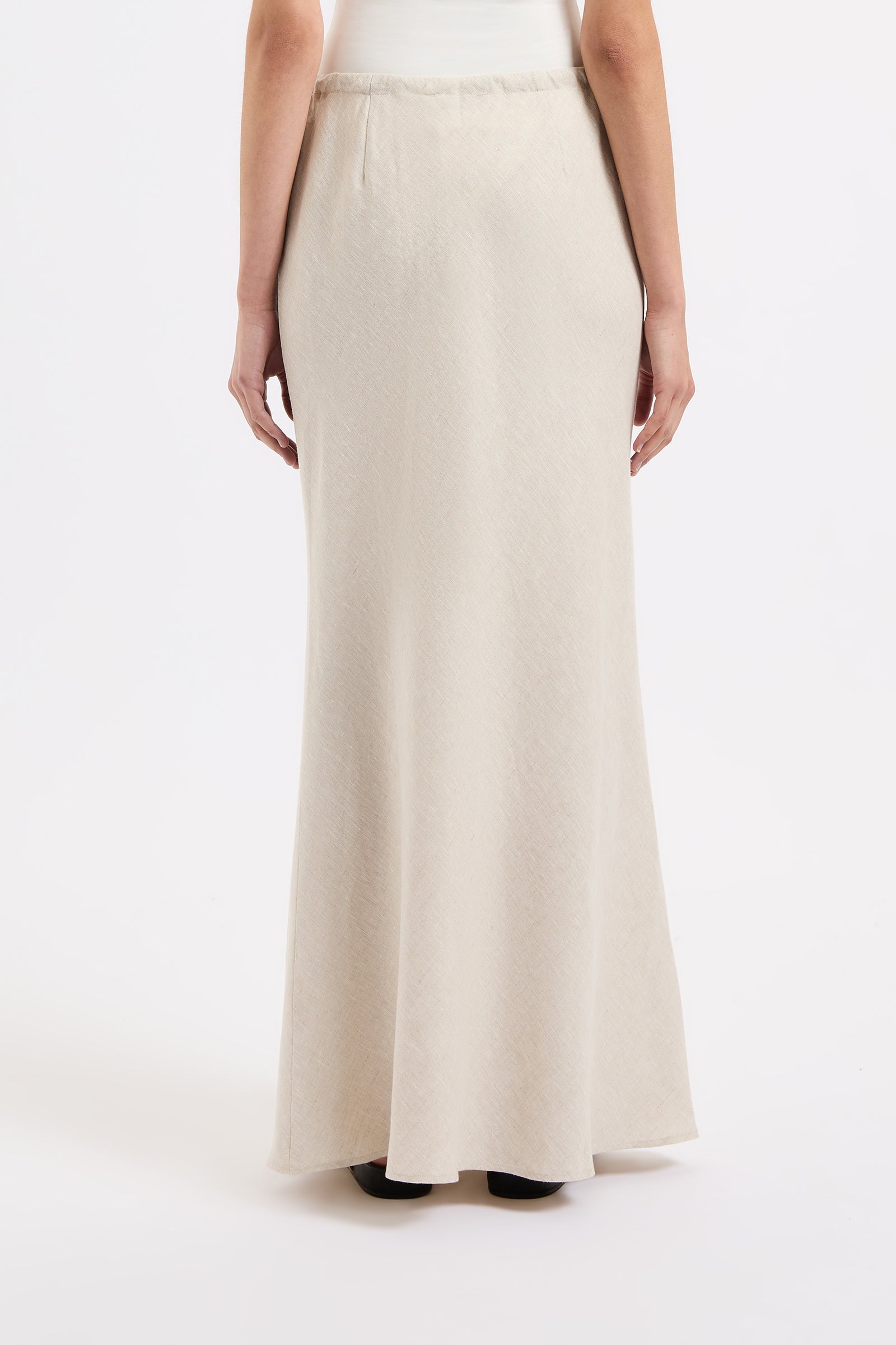 The Amani Linen Skirt in natural is made from a premium linen which has been washed for a smooth, soft hand feel. Cut on the bias, this silhouette finishes just above the ankles. Features include encased elasticated waistband with a self cut draw string at centre front.