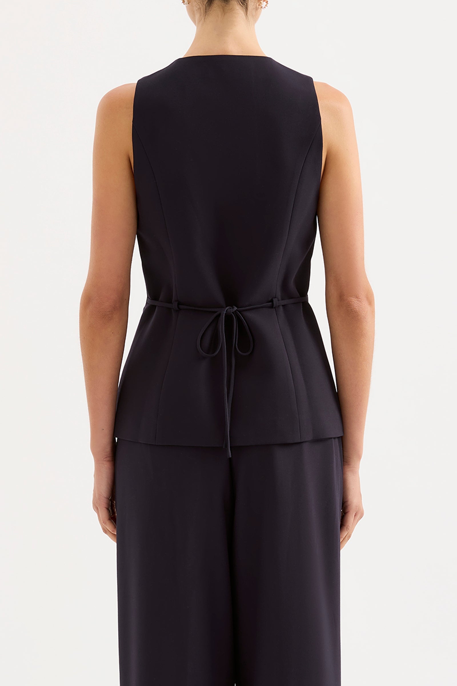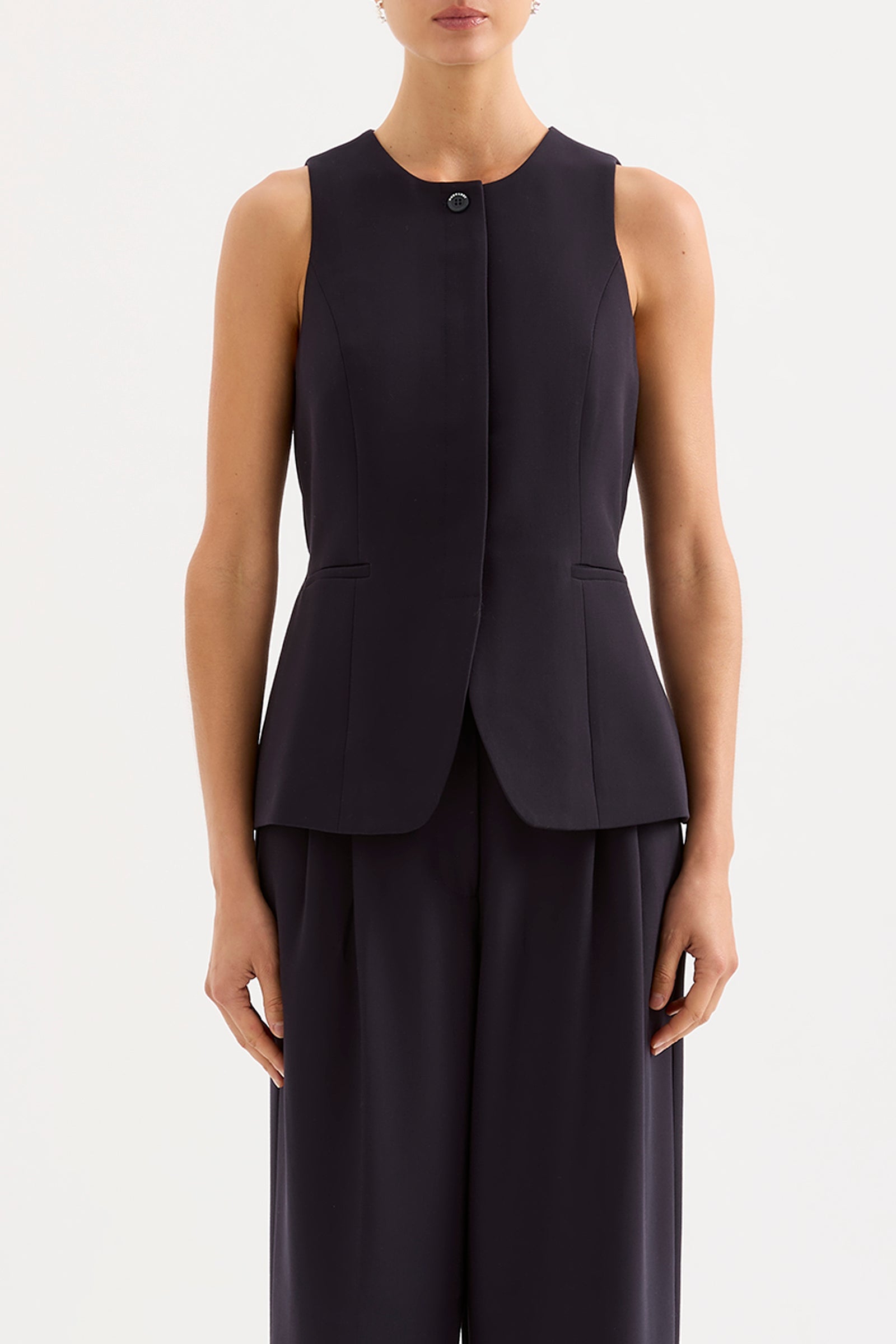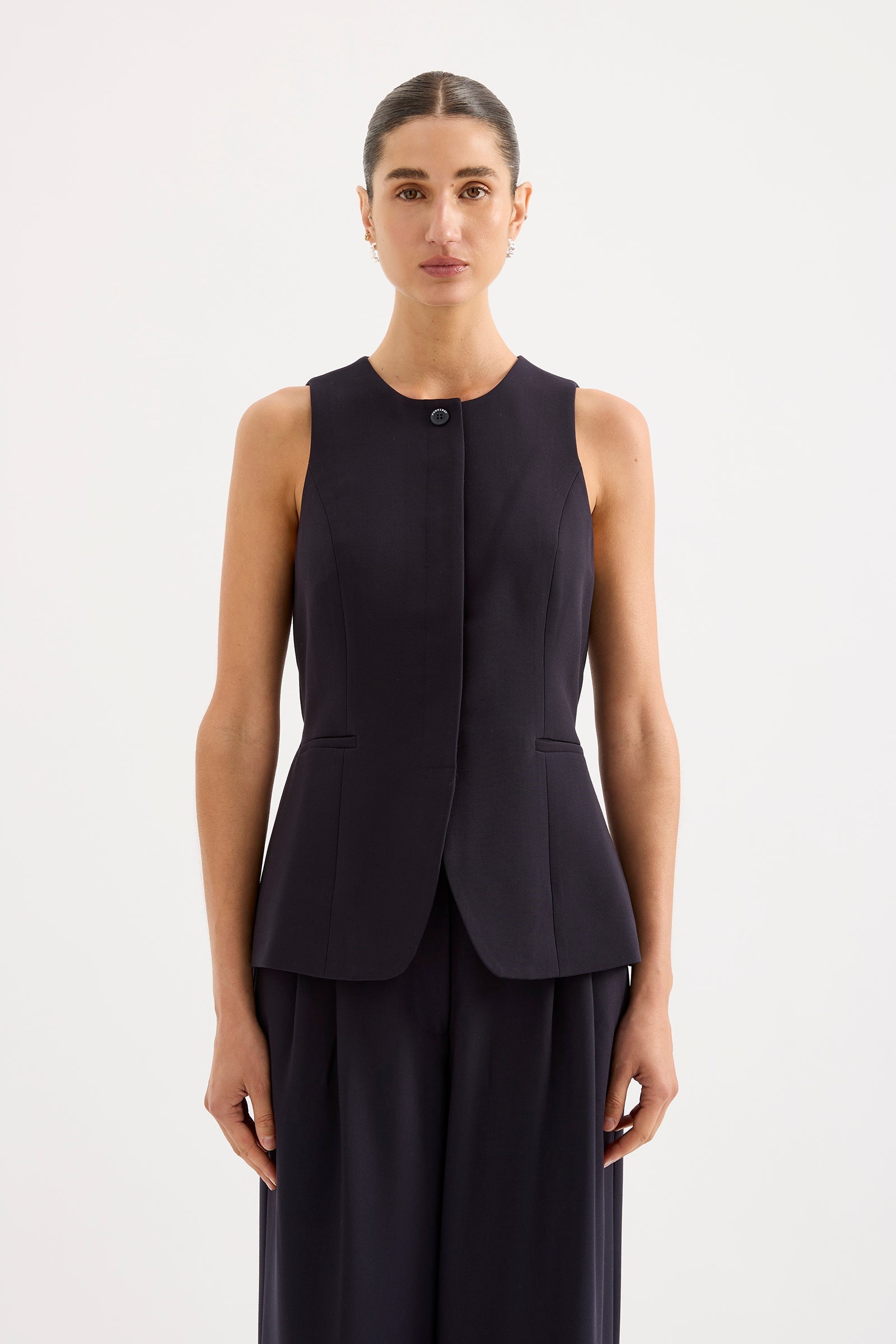 The Andrea Vest is made from a midweight tailoring fabric which has a smooth hand feel.  The silhouette is  structured and single breasted with a slim fit body. Features include traditional tailoring detailing throughout including branded buttons and tailored vents at back of body.