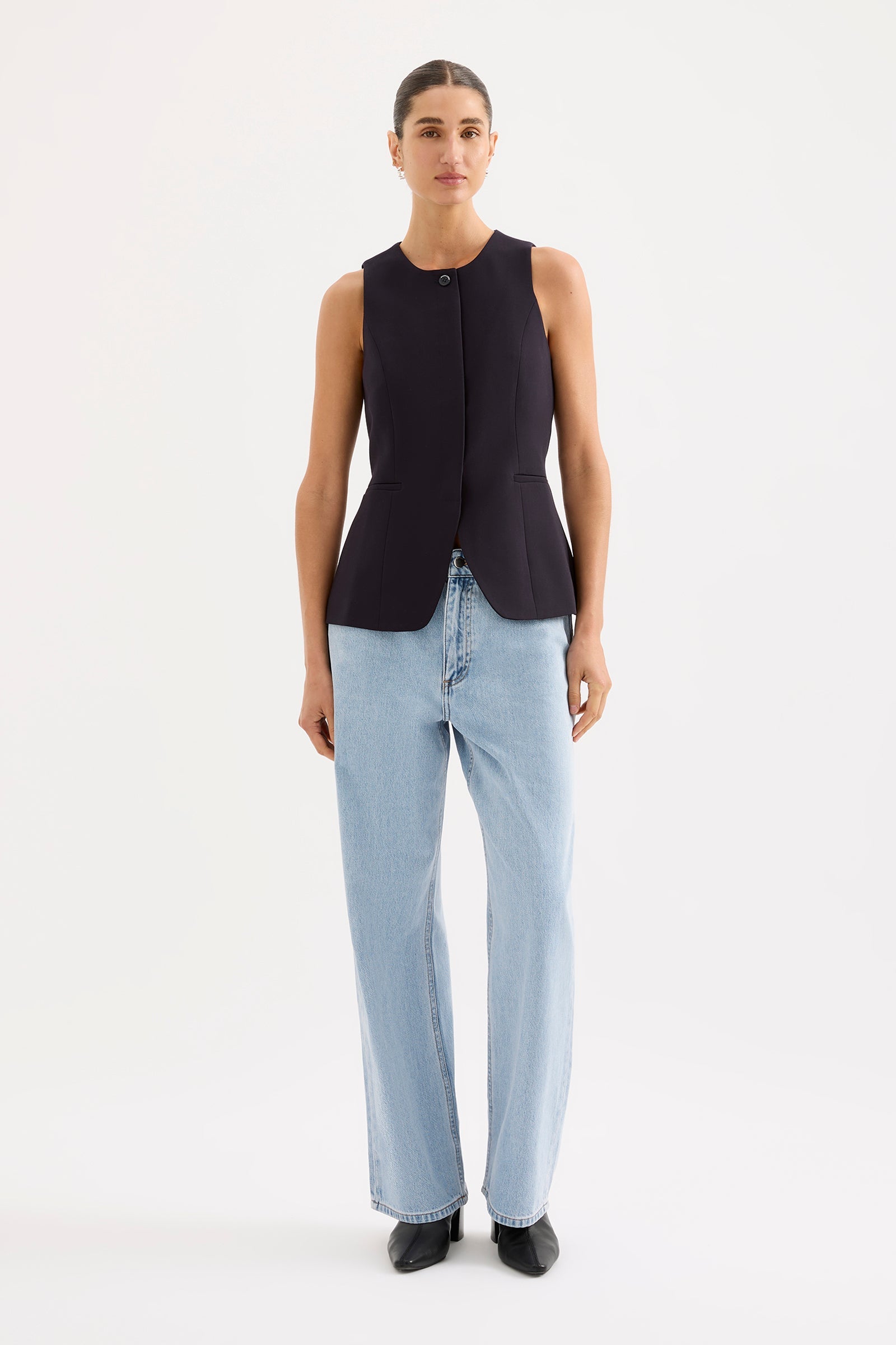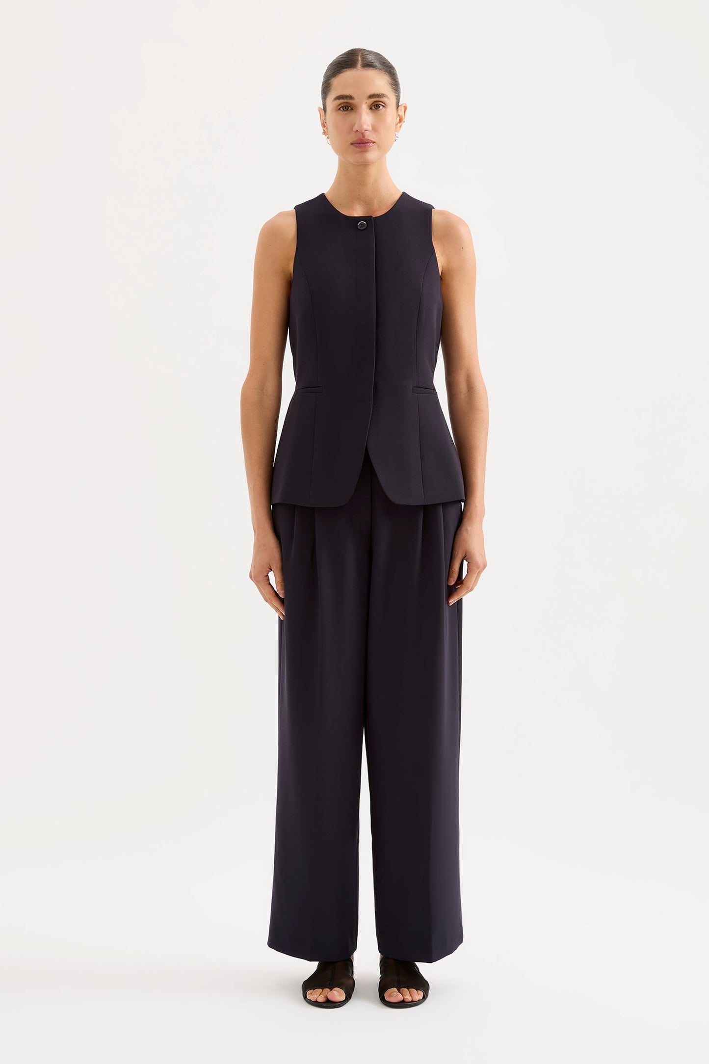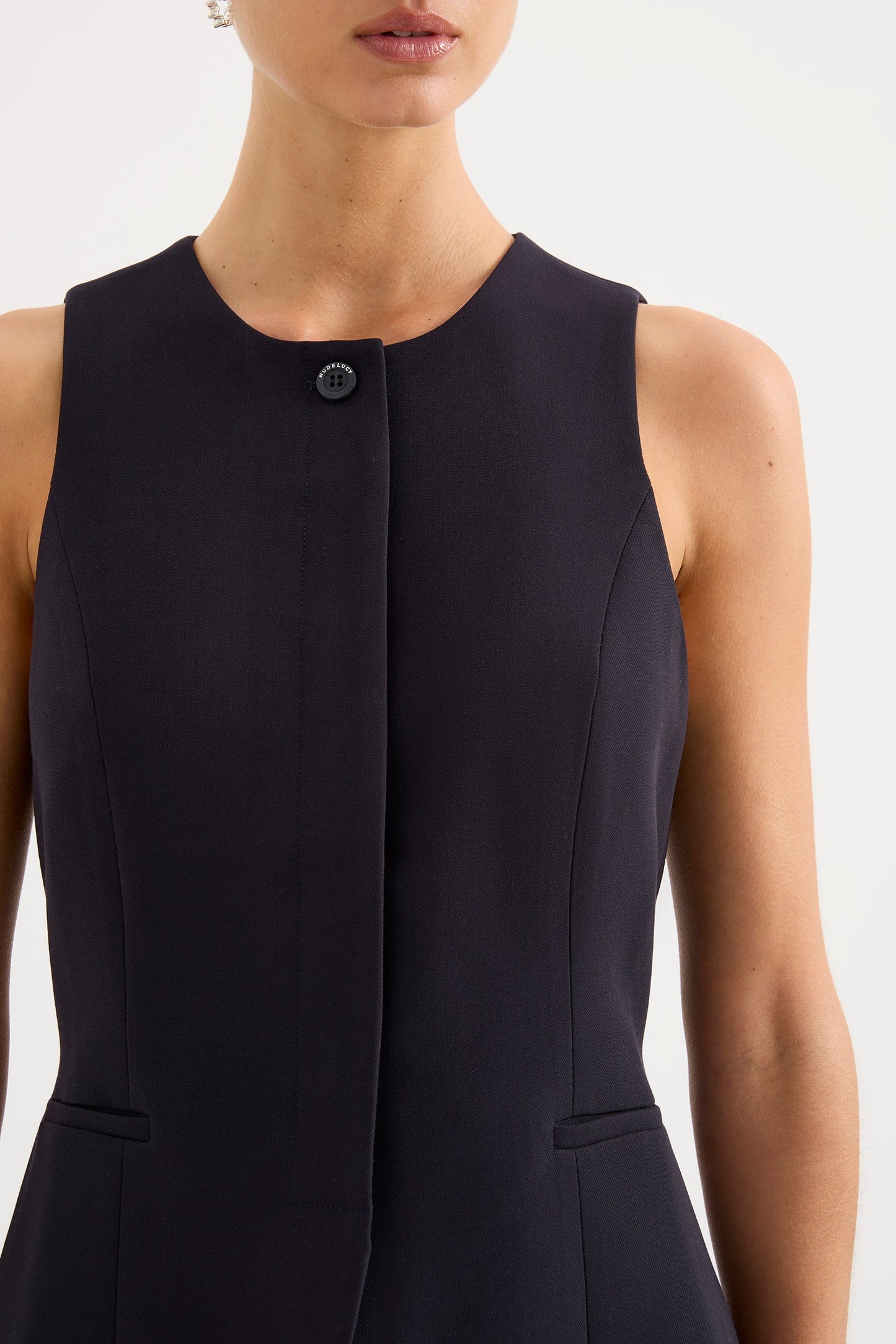 The Andrea Vest is made from a midweight tailoring fabric which has a smooth hand feel.  The silhouette is  structured and single breasted with a slim fit body. Features include traditional tailoring detailing throughout including branded buttons and tailored vents at back of body.