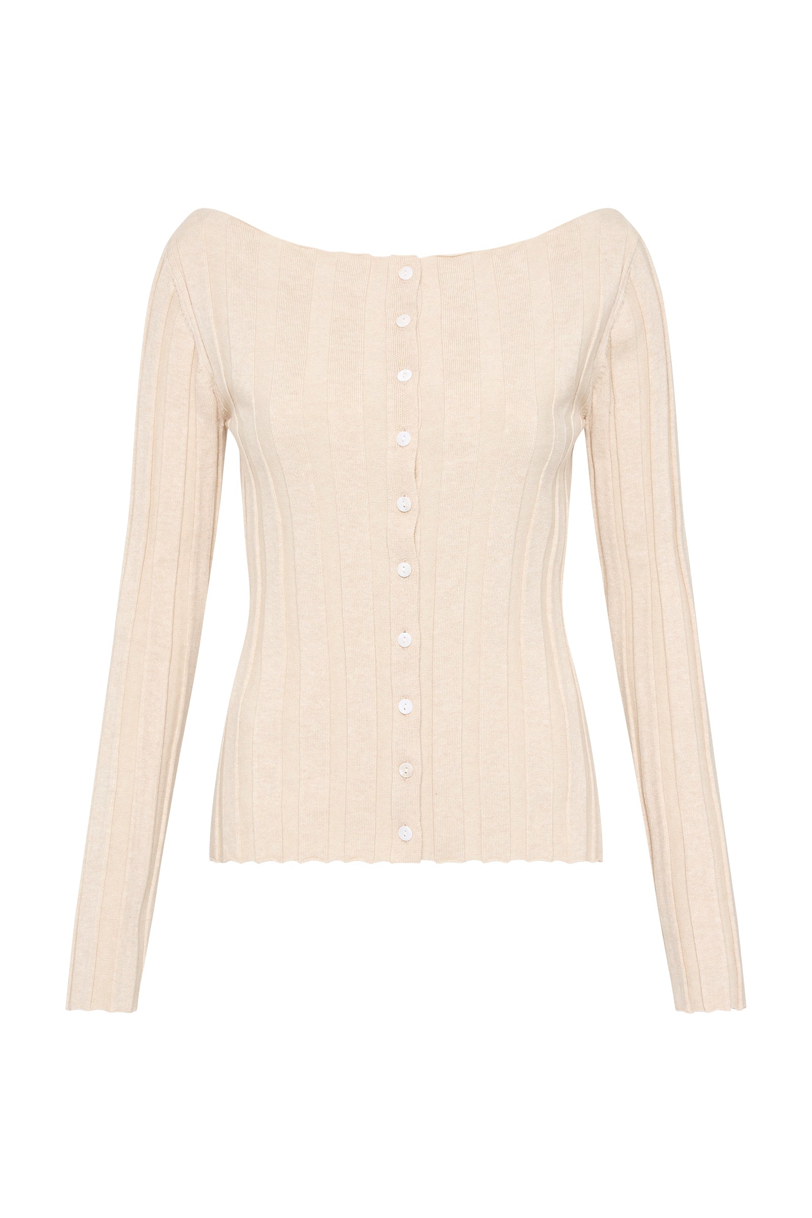 The Aneke Knit Top is made from a lightweight cotton blend yarn which is soft on the skin. The silhouette is slim fitting with full length sleeves and length sitting at hip level. Features include a wide rib pattern construction through the body, boat neckline and shell buttons.