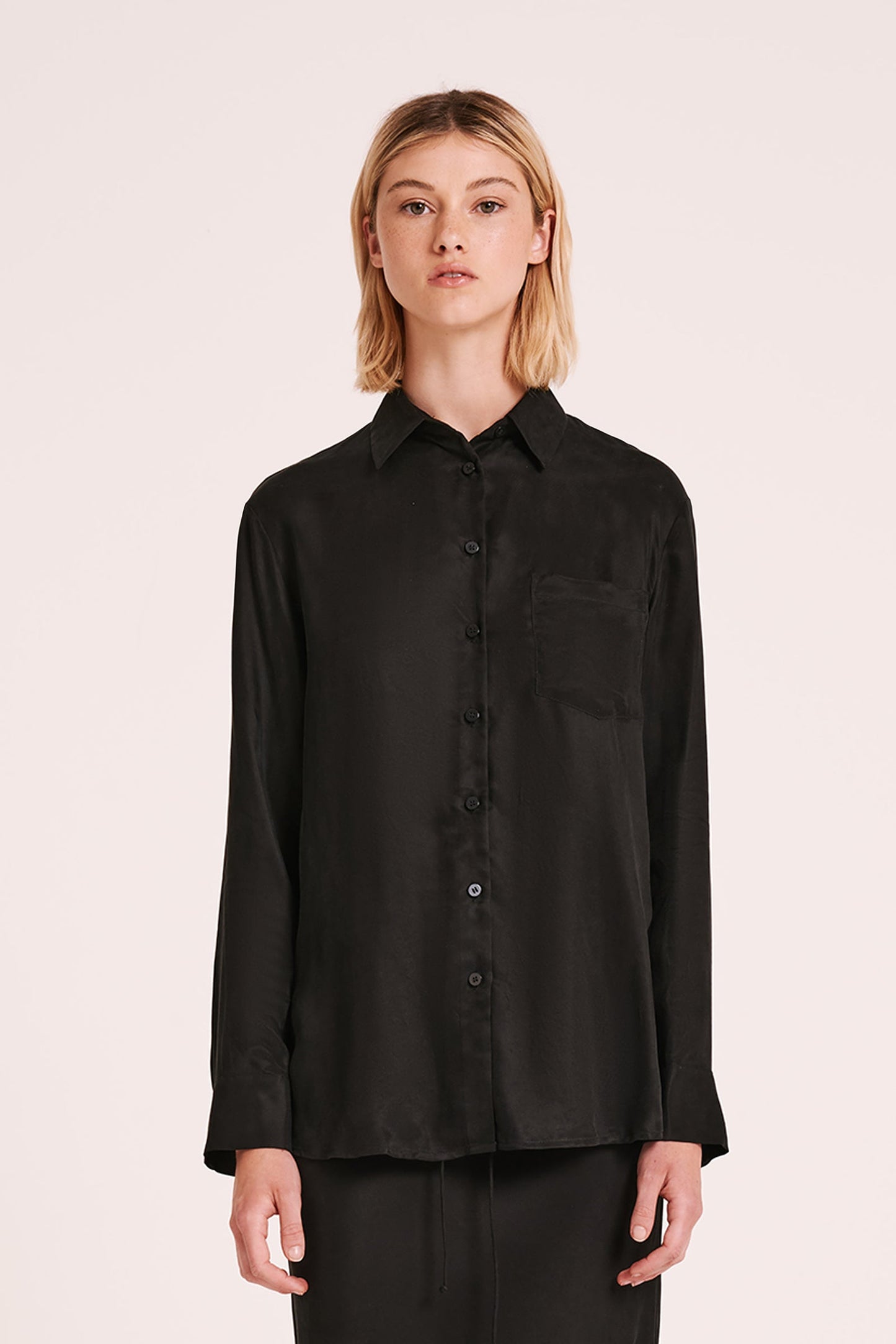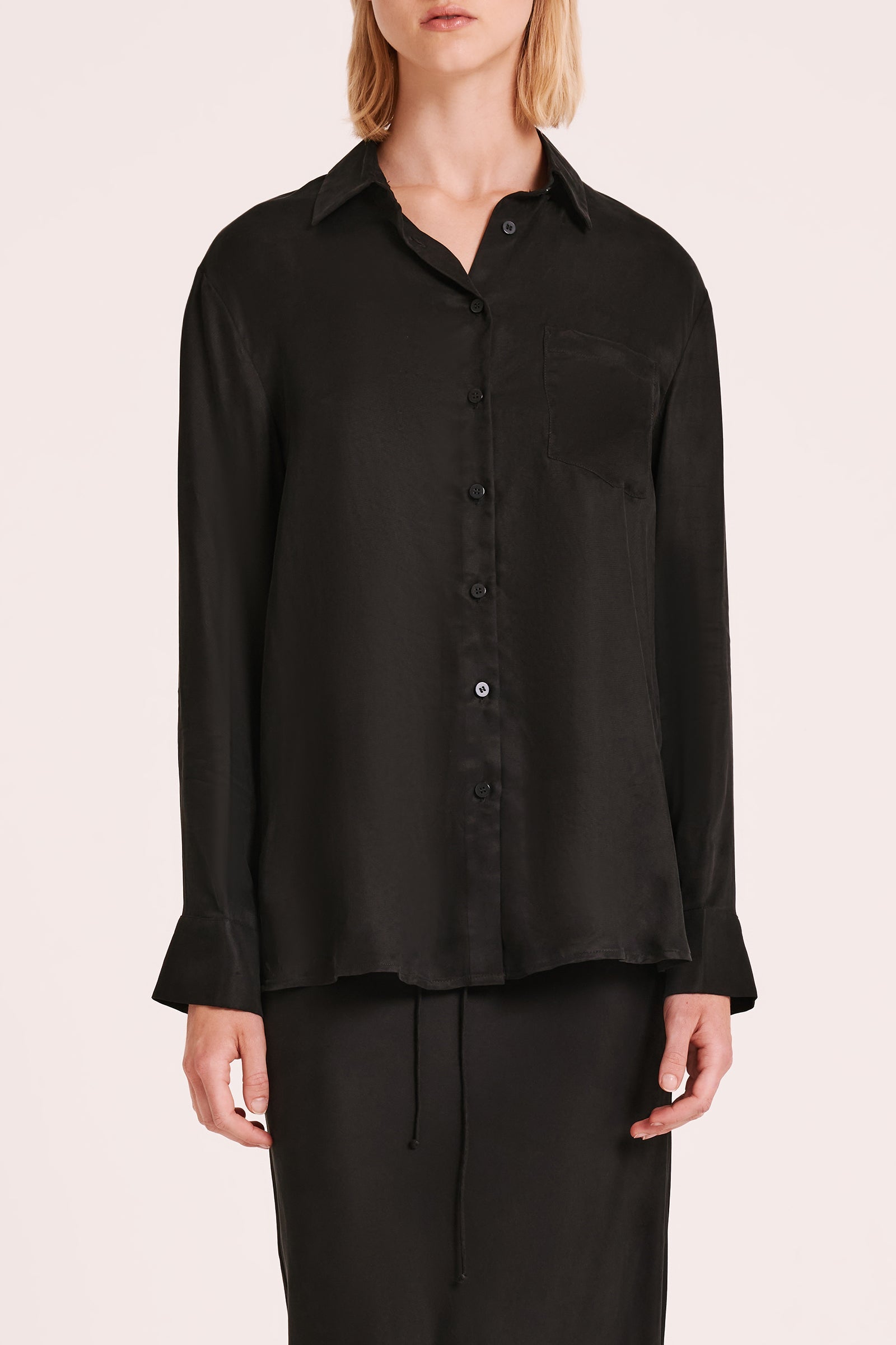 The Ari Long Sleeve Cupro Shirt is made in our signature cupro with a soft, sueded hand feel. The silhouette is relaxed and oversized through the body with the length finishing below the hips. Features include classic shirt detailing with front patch pockets. Wear it open as a soft jacket or layering piece.