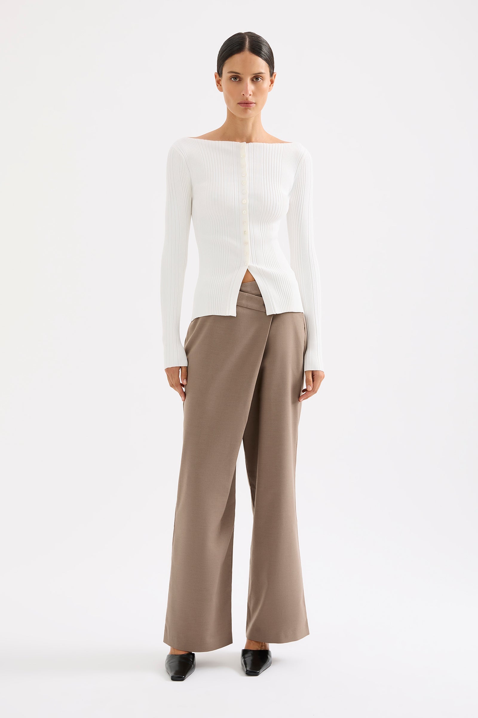 The Aylin Knit LS Top is made from a viscose blend yarn, knitted into an irregular rib pattern which has a dry hand feel. The silhouette is fitted with long sleeves and length finishing at the hips. Features include a boat neckline and shell buttons.