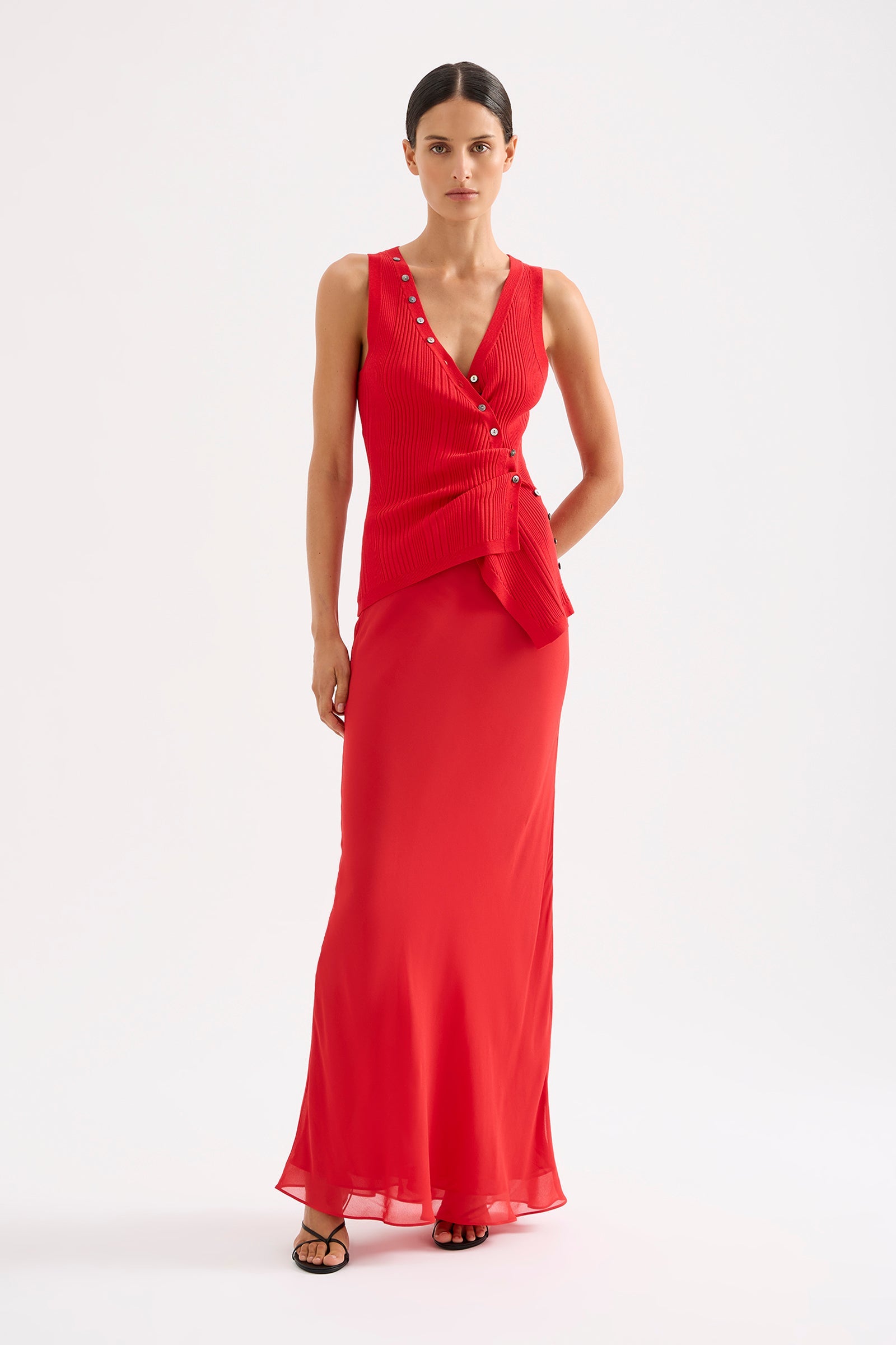 The Aylin Knit Tank is made from a viscose blend yarn, knitted into an irregular rib pattern which has a dry handfeel. The silhouette is fitted with a V neckline and length finishing at the hips. Features include asymmetrical wrap over and hem and shell buttons.