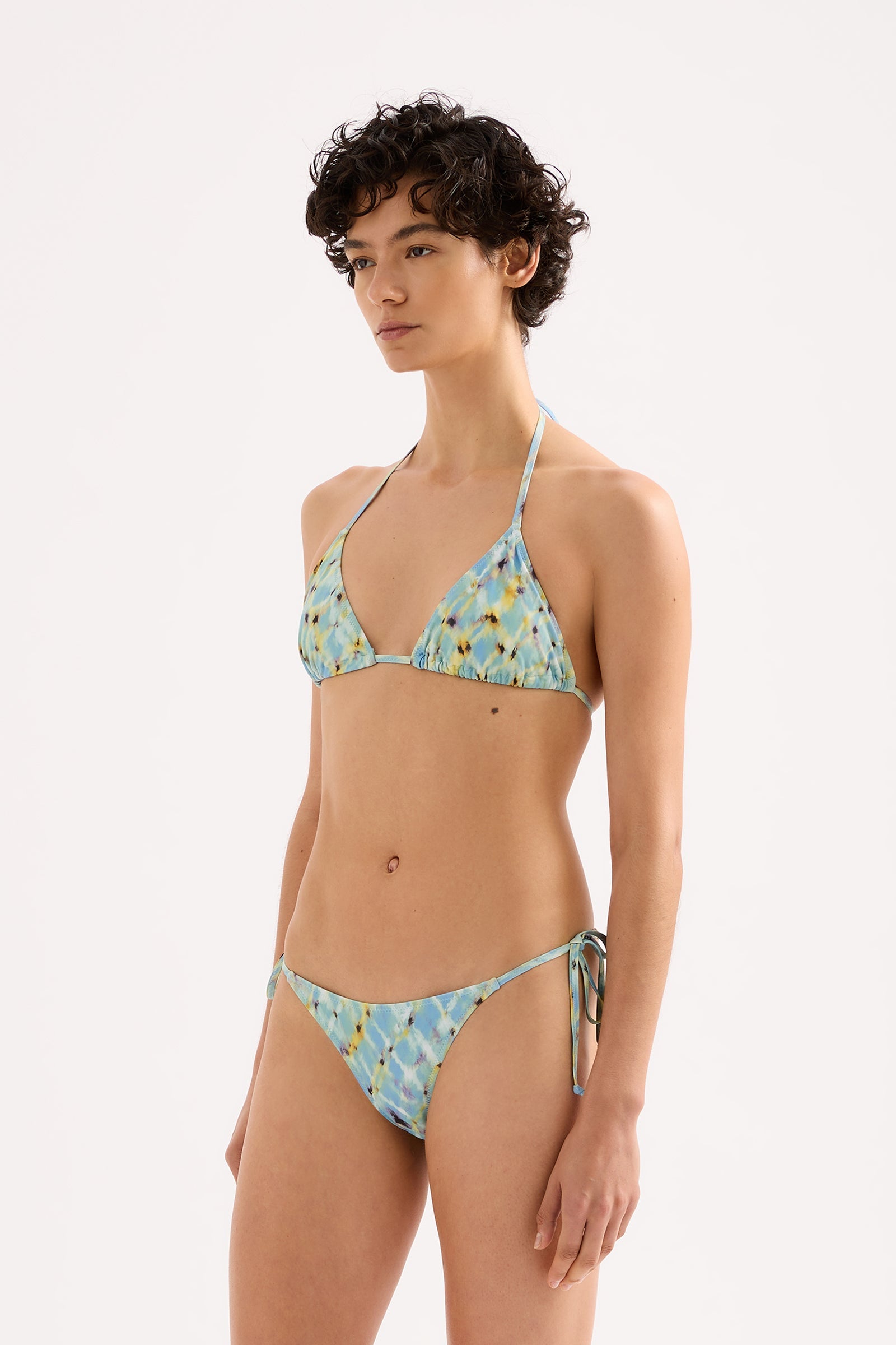 The Azzuro Triangle Top is made from a premium recycled stretch fabrication in our exclusive Azzurro print. The top has a soft tri cup bust and thin elasticated halter straps. Features include adjustable neck and body. This classic cut supports all bust sizes. This top is fully lined.