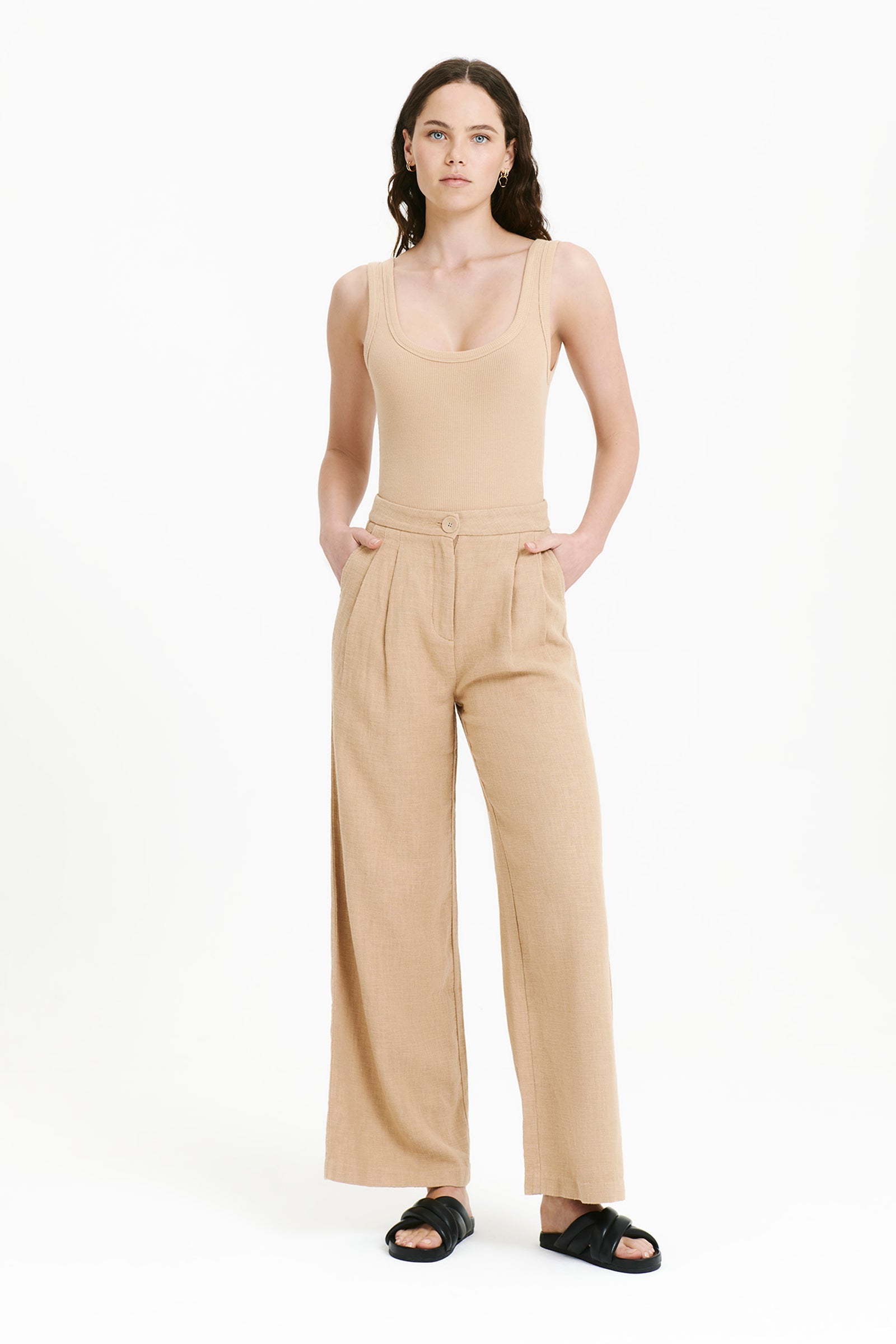 The Blair Pant is a classic wide leg silhouette made in a premium heavy weight linen blend fabrication. Cut is relaxed with a high waist and finishing full length. Features include a functioning fly front with a fitted waitband, front pleats at waist and pockets.