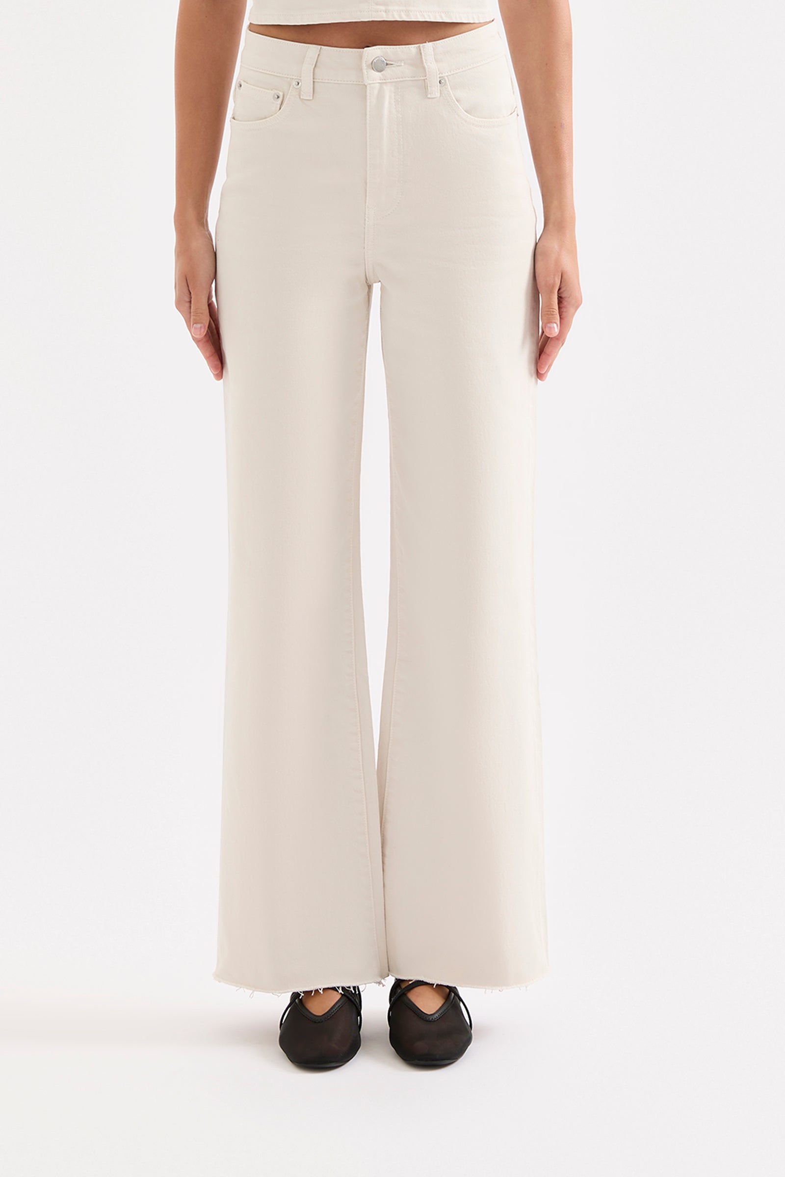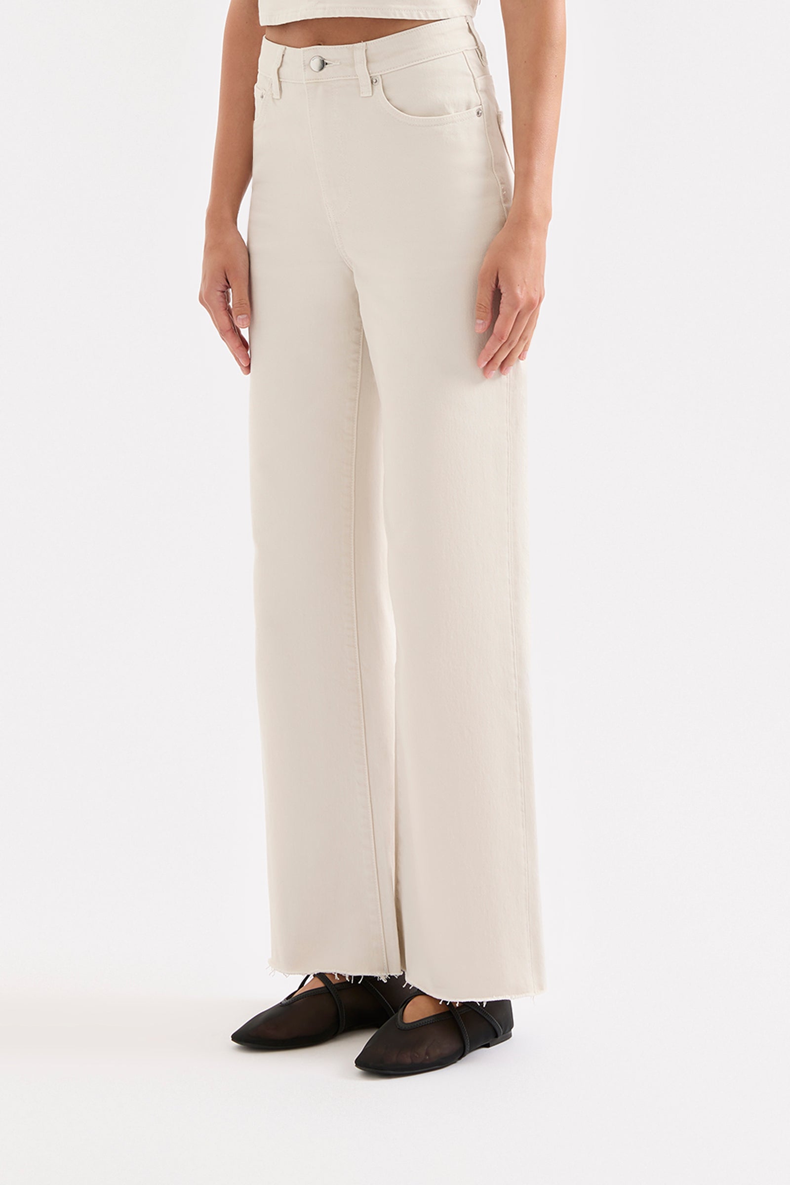The Cali Stretch Wide Leg Jean is made from a stretch organic cotton denim that has been washed to a stone wash Dune. The silhouette is high rise, fitted to the waist and relaxed from thigh to ankle. Features include raw hem finish branded shank button, rivets & Jacron Back patch. Fits true to size.