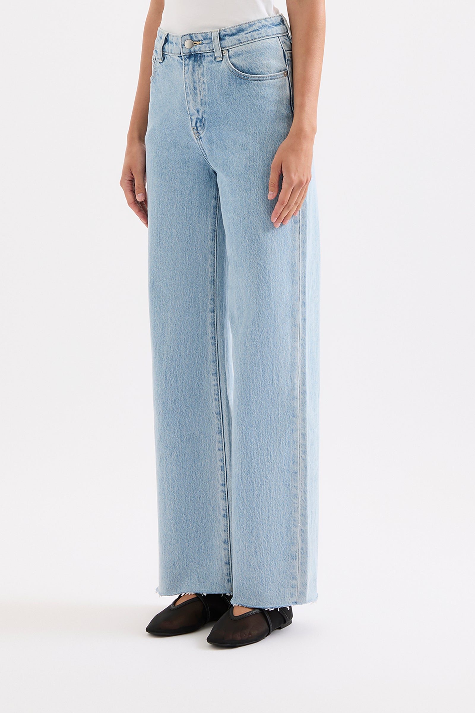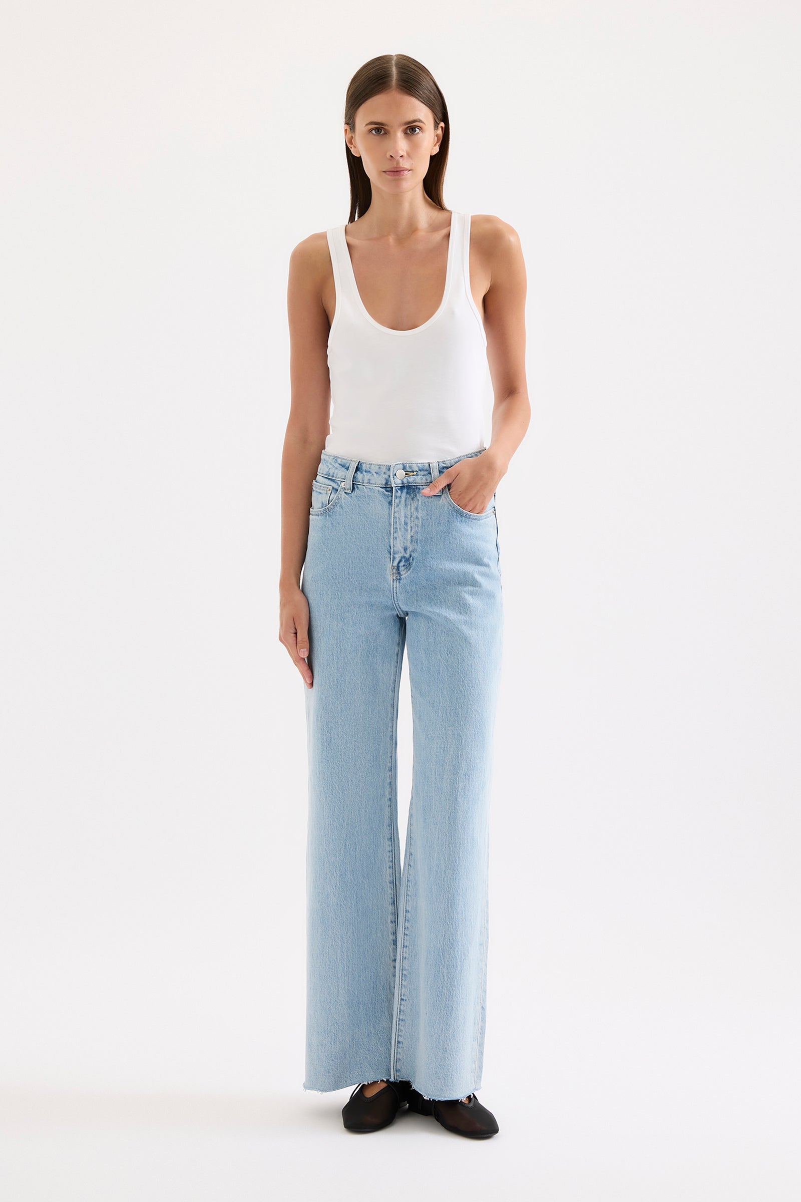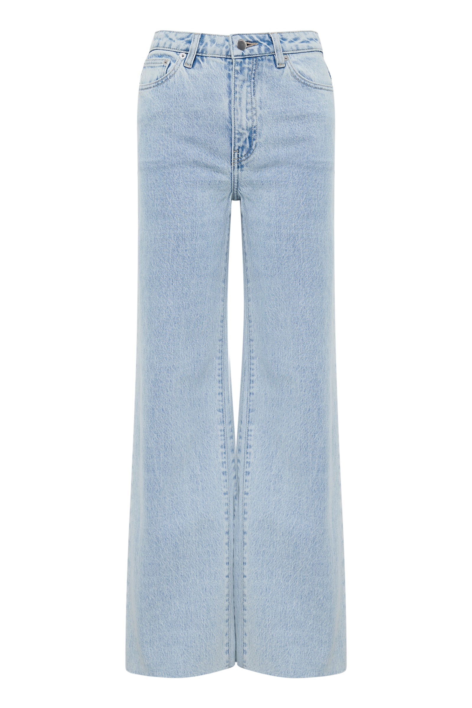 The Cali Stretch Wide Leg Jean is made from a stretch organic cotton denim that has been washed to a stone wash sky blue. The silhouette is high rise, fitted to the waist and relaxed from thigh to ankle. Features include raw hem finish branded shank button, rivets & Jacron Back patch. Fits true to size.
