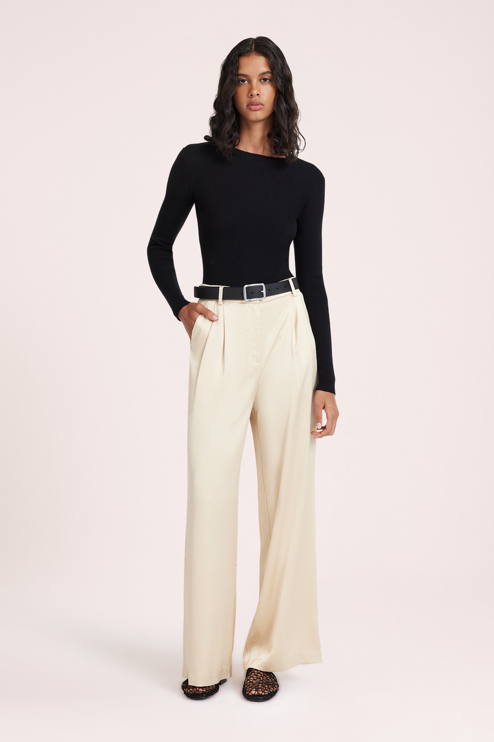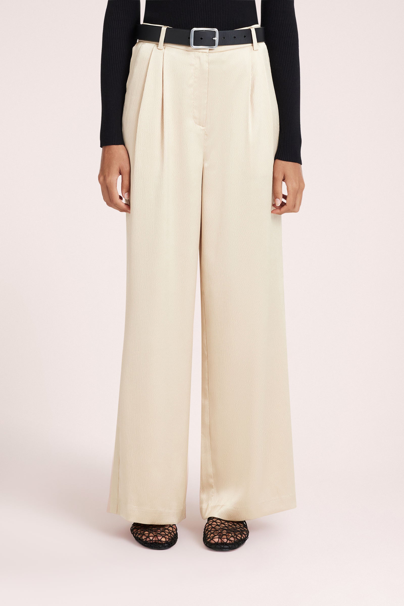 The Camile Pant is made from a recycled fabric which has a shiny, textured hand feel. The silhouette is a classic high-rise with wide tailored leg finishing full length. Features include front pleats at waist, elasticated back waistband & concealed button and trouser hook closure.
