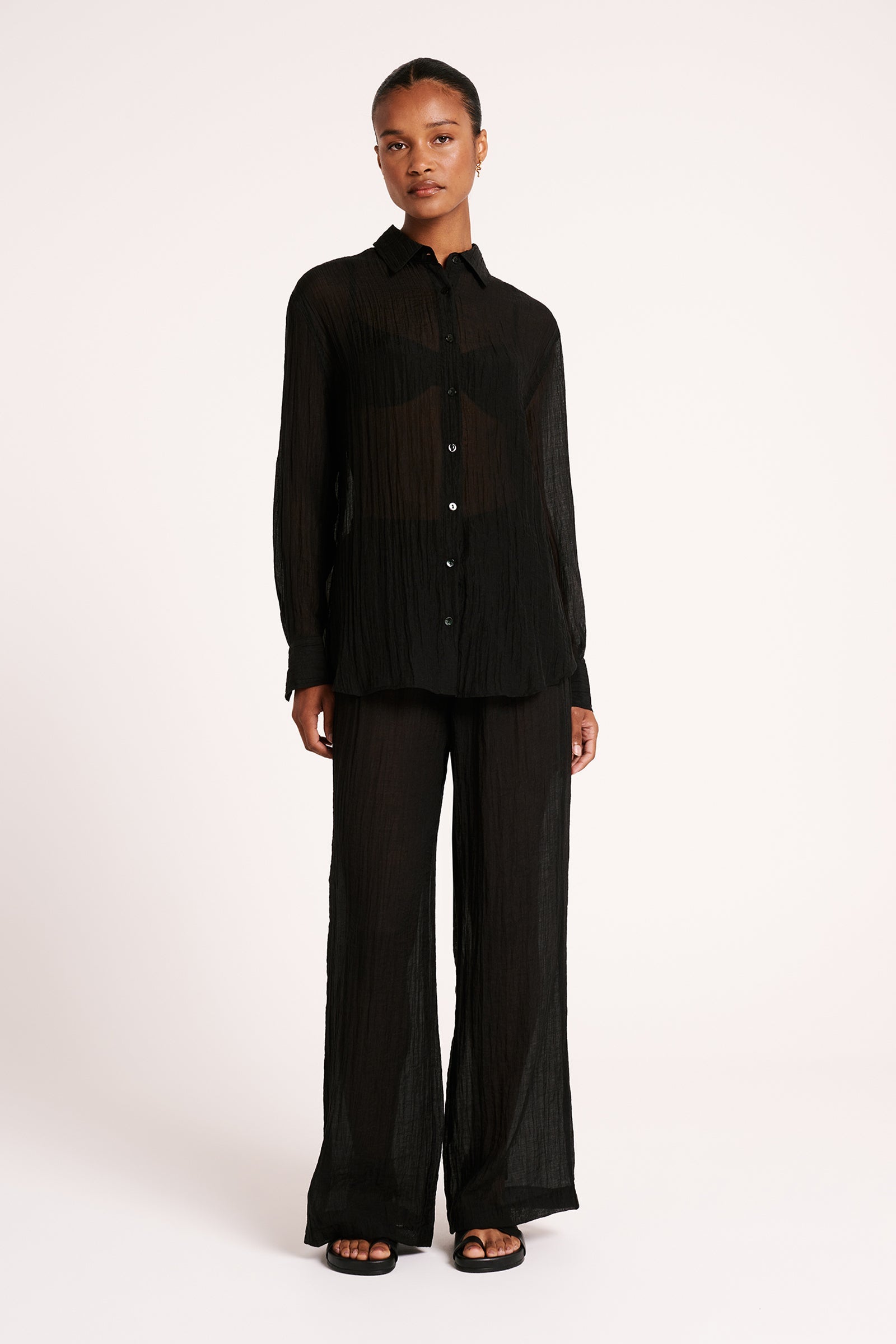 The Carmen Shirt in black is made from a lightweight lyocell blend fabric which has a crinkle effect and dry hand feel. The silhouette is relaxed with length finishing at the hip. Features include classic shirting details with front patch pocket and shell buttons.