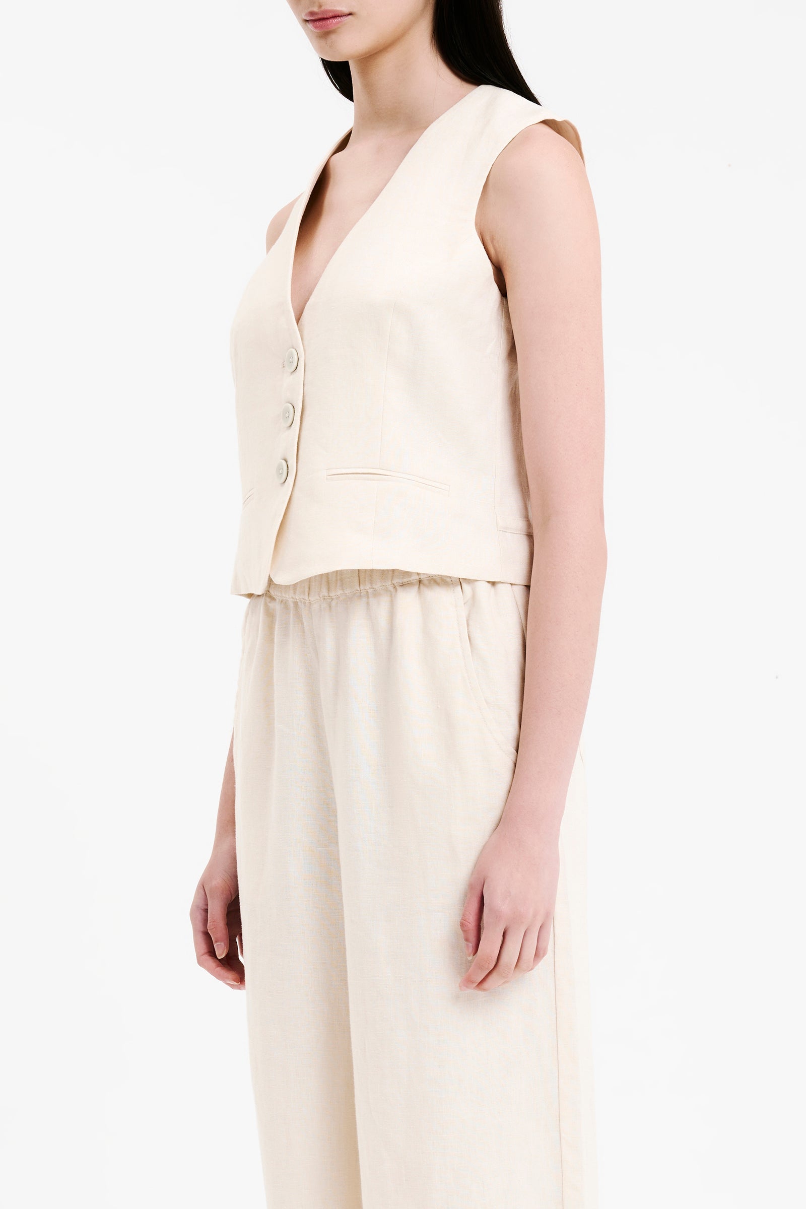 The Ceres Linen Vest is made in our premium 100% lightweight linen. The tailored silhouette is slim fitting with a deep V neck and button front opening.  Features include traditional waistcoat detailing and adjustable drawstring through back waist. The vest is fully lined.
