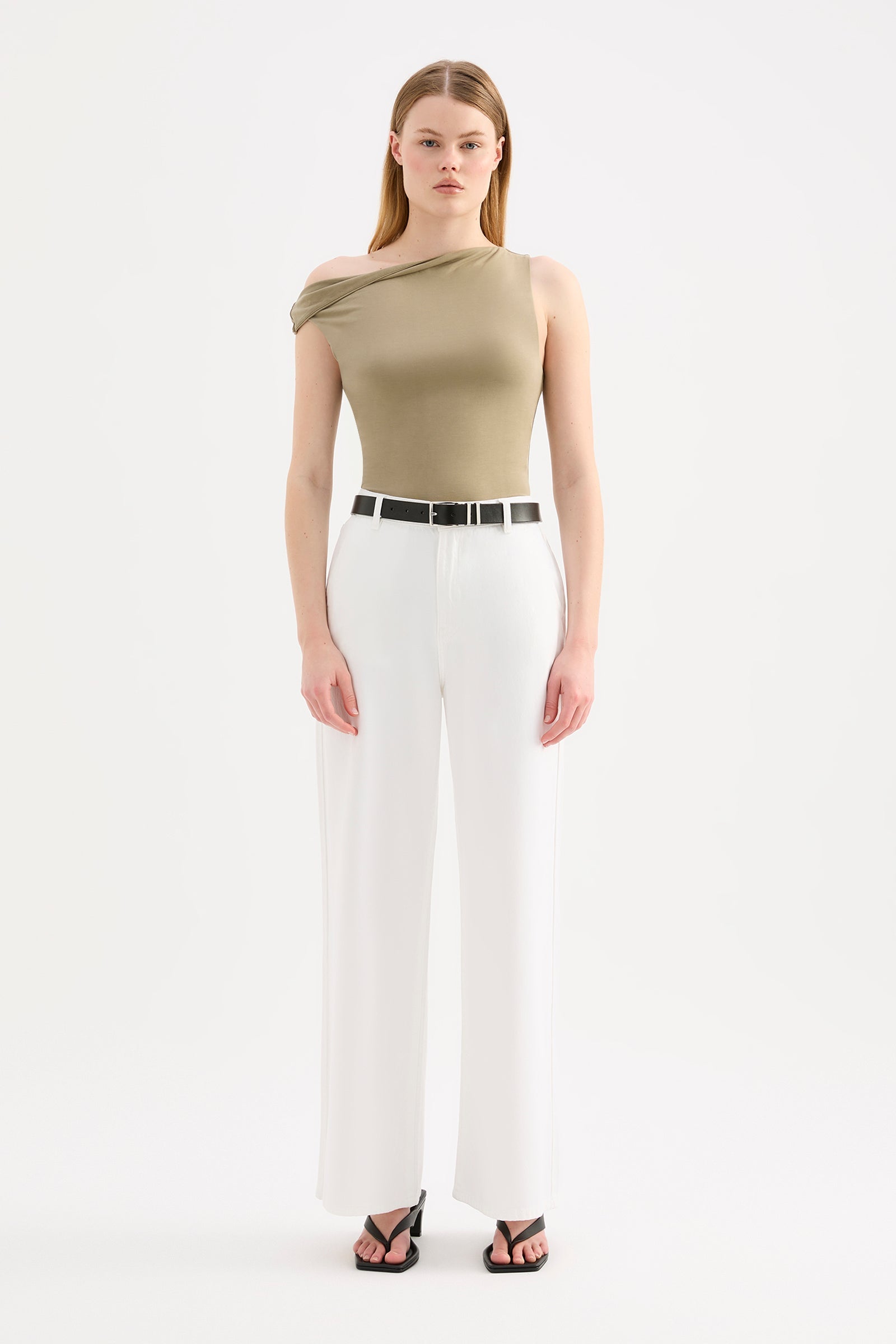 The Chelsea Top is made from a midweight modal fabrication which has a soft, slinky hand feel. The silhouette is a flattering close and finishes at the hips. Features include an asymmetric neckline, with a twist on the off shoulder sleeve.