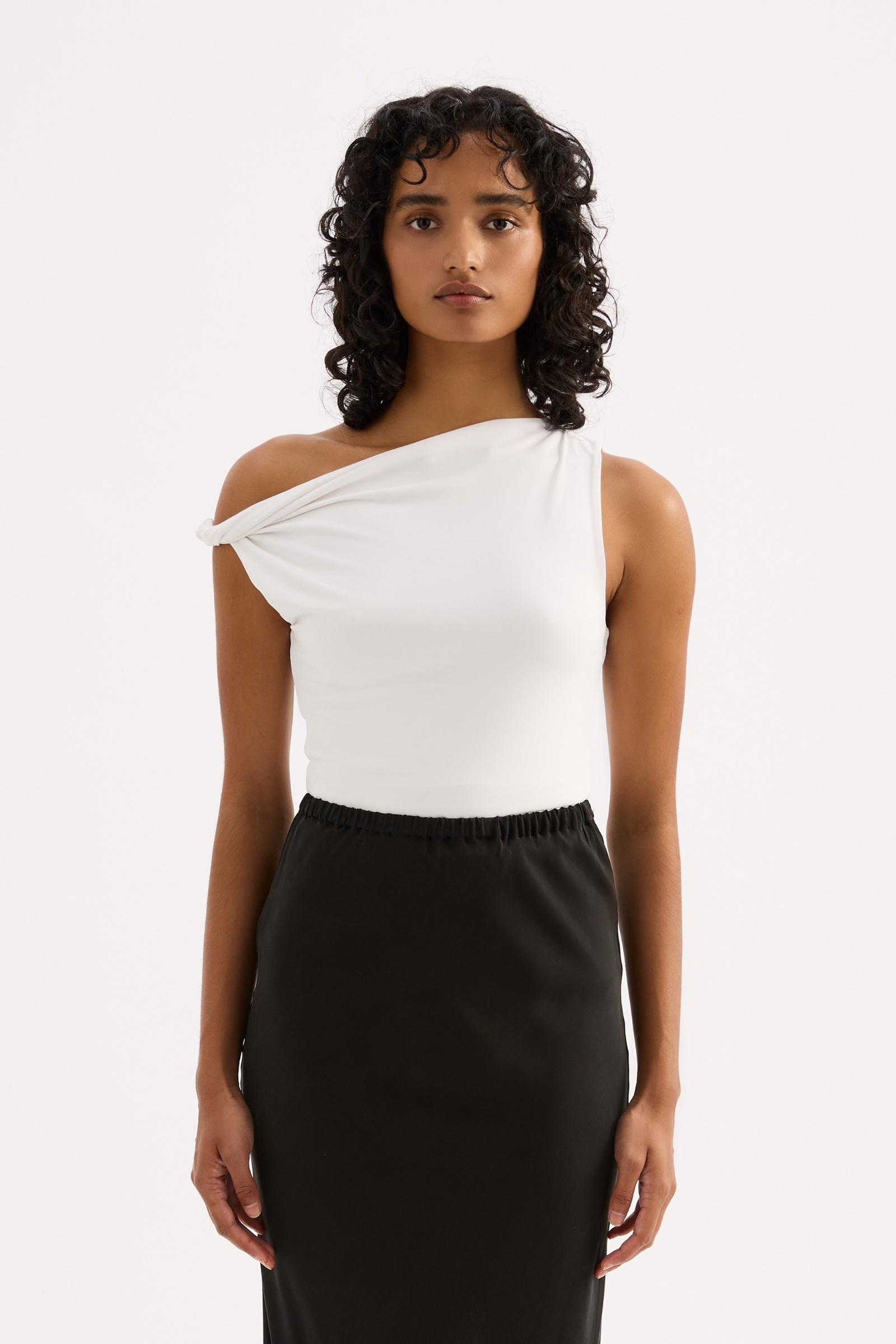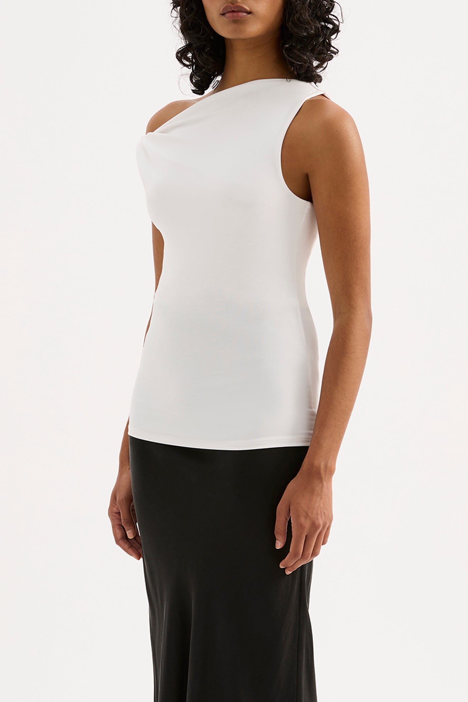 The Chelsea Top is made from a midweight modal fabrication which has a soft, slinky hand feel. The silhouette is a flattering close and finishes at the hips. Features include an asymmetric neckline, with a twist on the off shoulder sleeve.