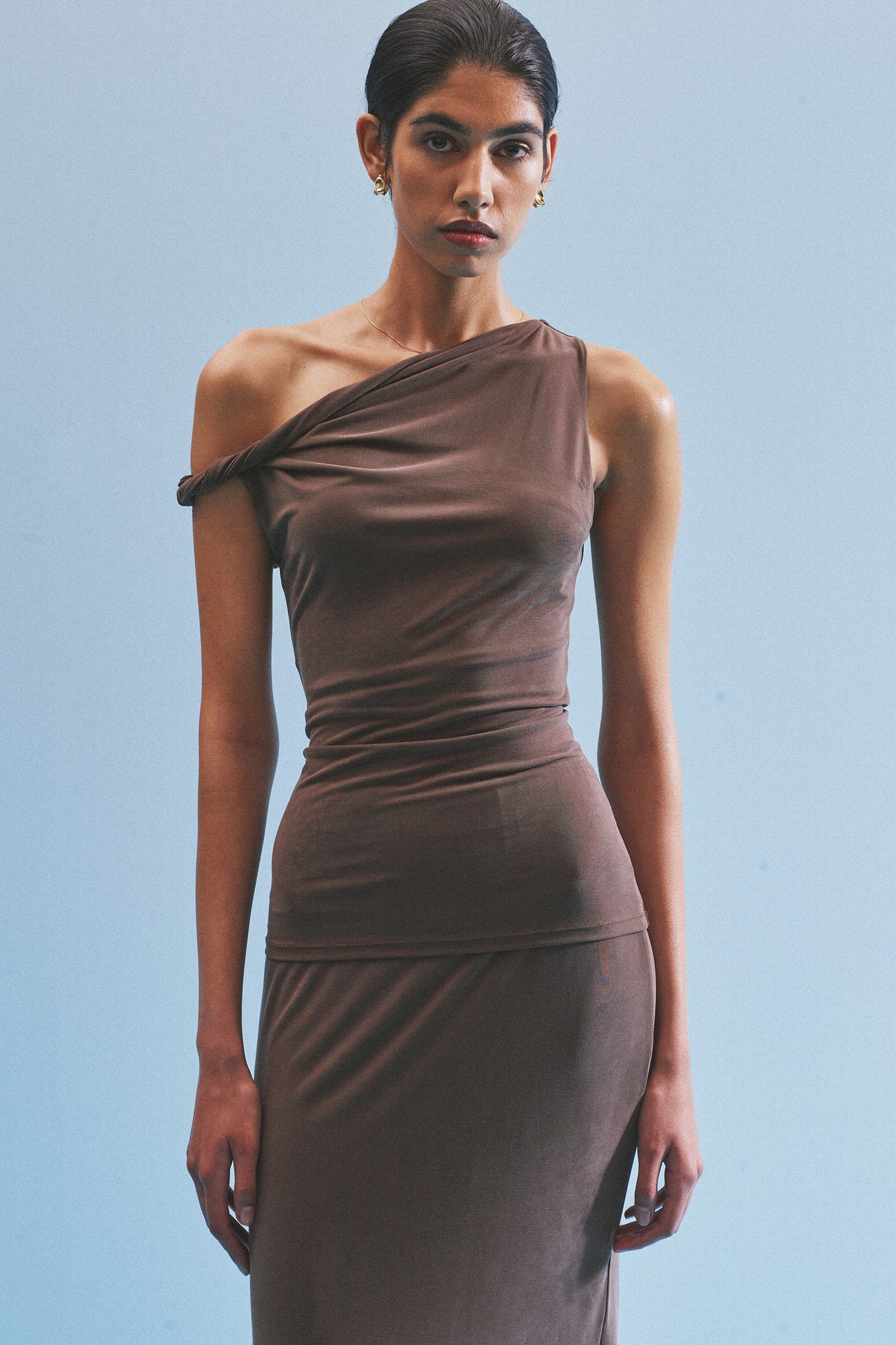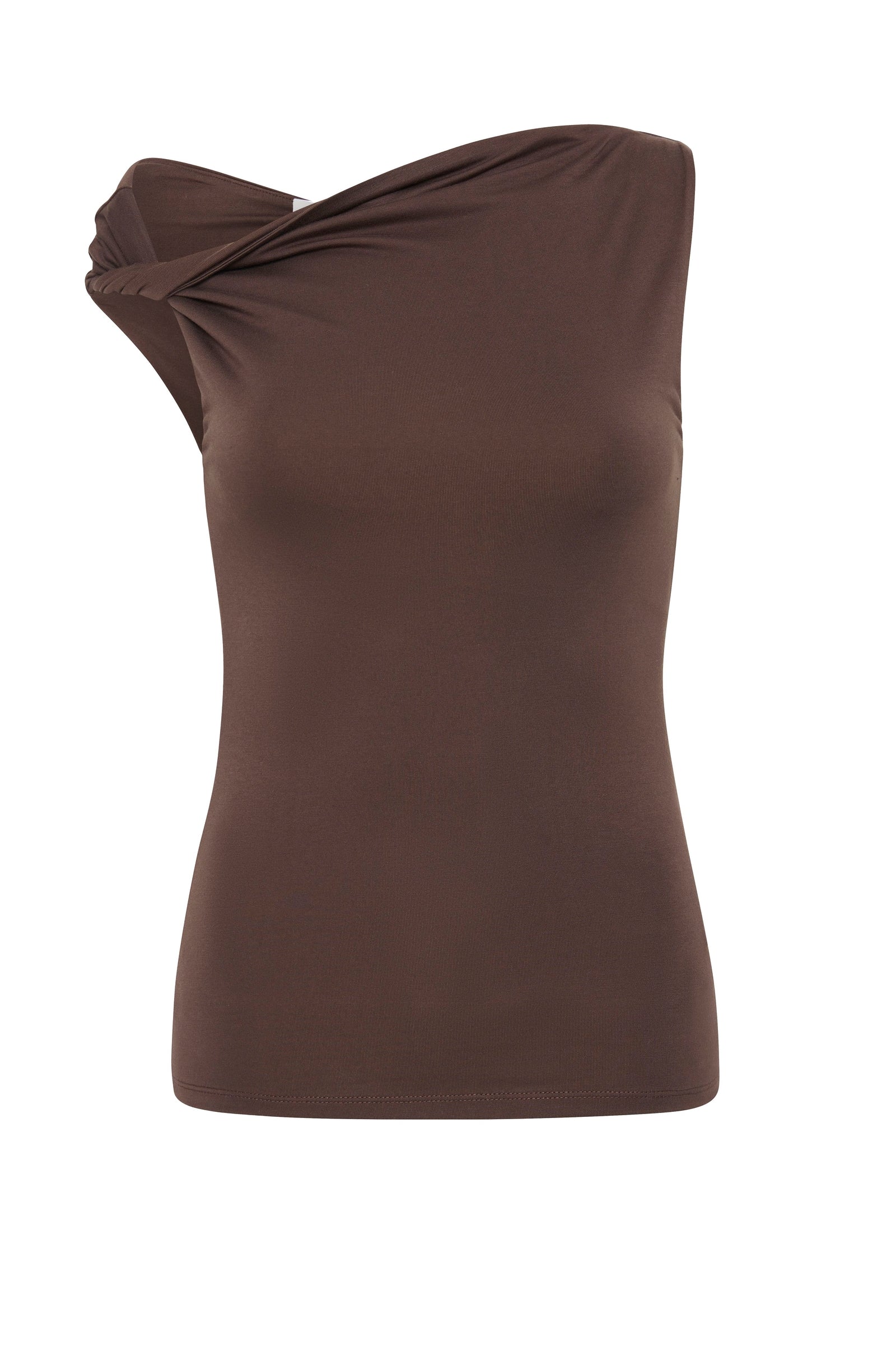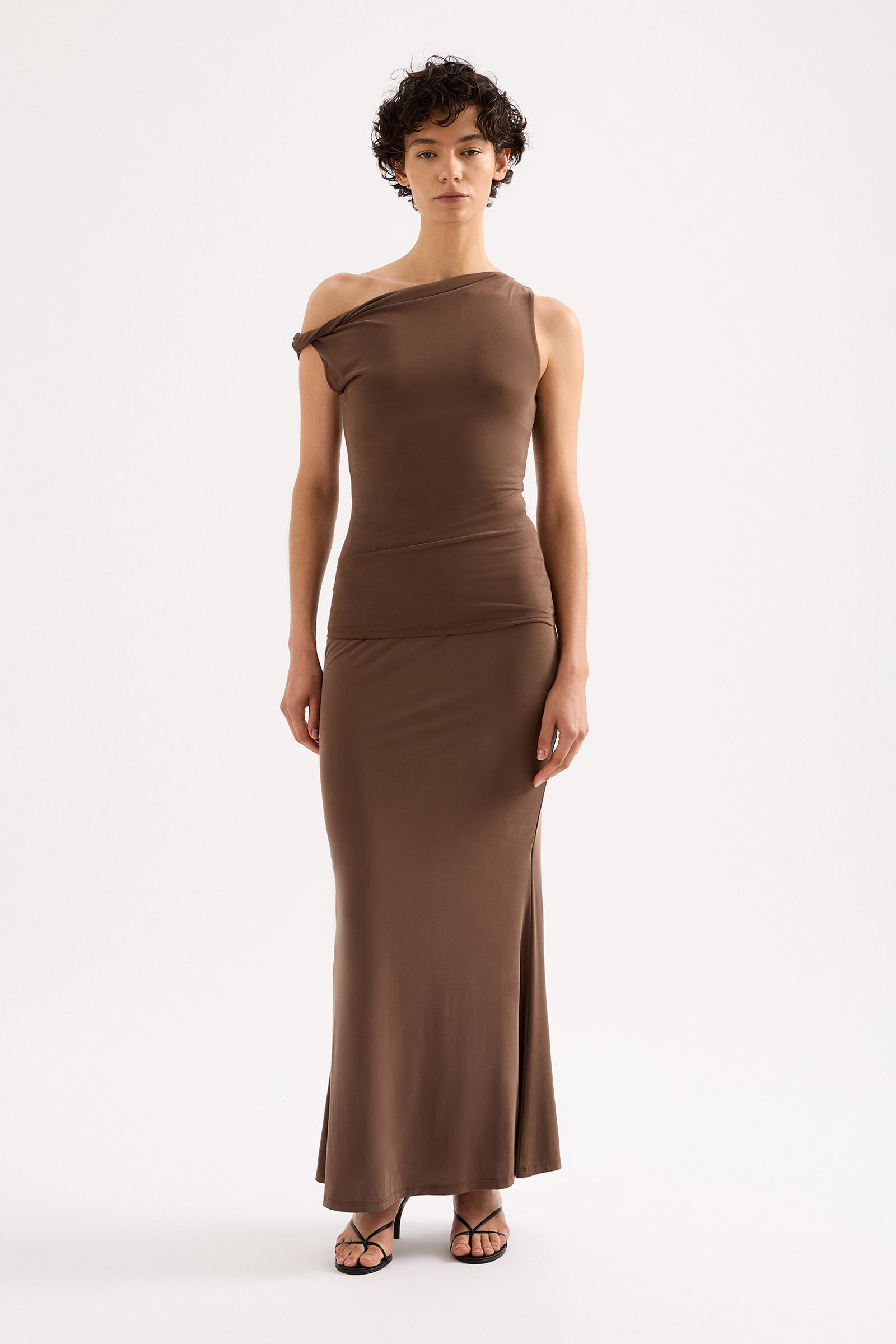The Chelsea Top is made from a midweight modal fabrication which has a soft, slinky hand feel. The silhouette is a flattering close and finishes at the hips. Features include an asymmetric neckline, with a twist on the off shoulder sleeve.