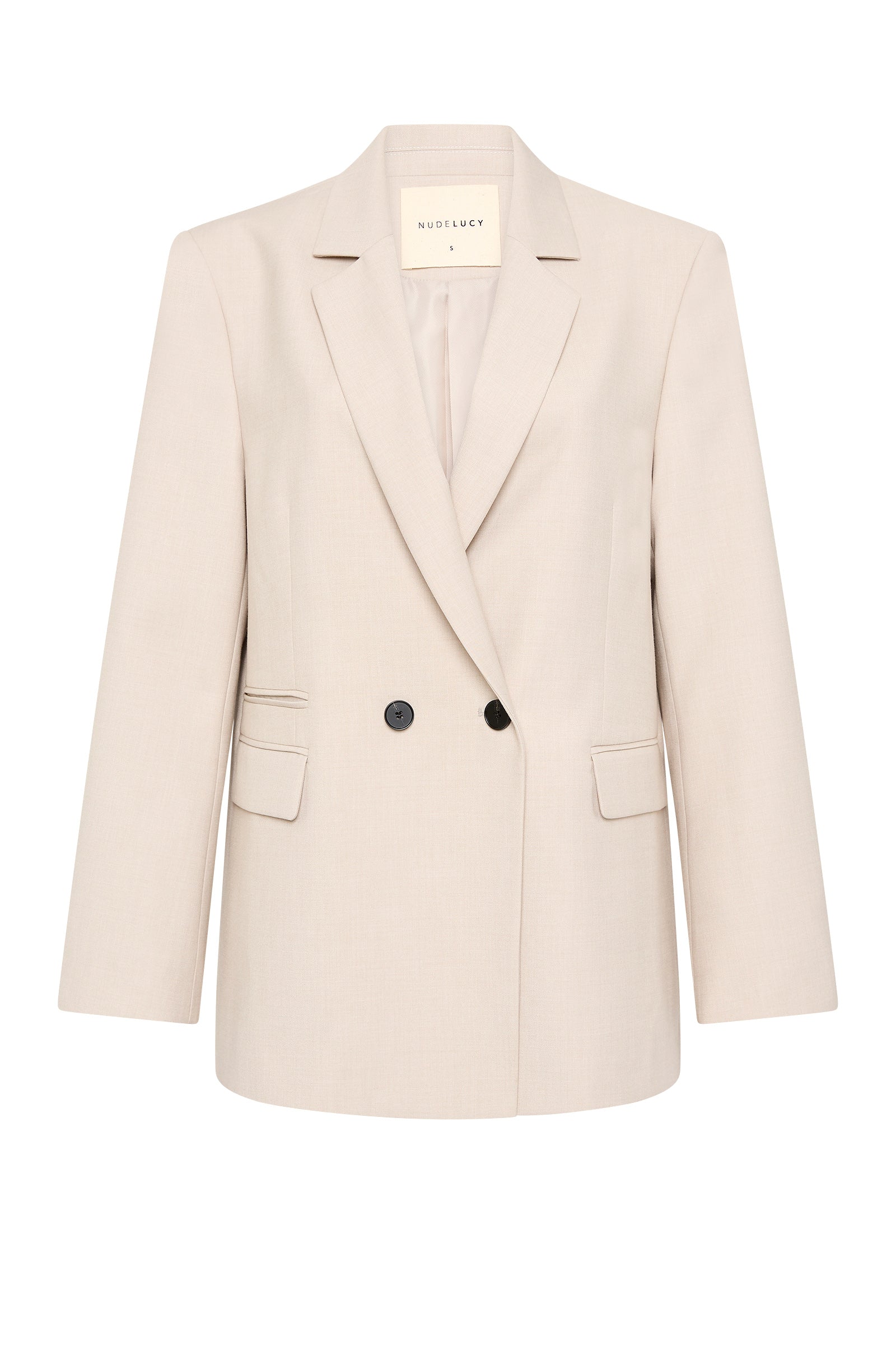 The Chiara Blazer is made from a classic suiting fabrication which has a smooth, structured hand feel. The silhouette is a structured double breasted shape with classic sloped shoulder, relaxed to slim fit body & full length sleeve. Features include traditional tailoring detailing throughout including branded buttons, tailored vents at sleeves and back of body.
