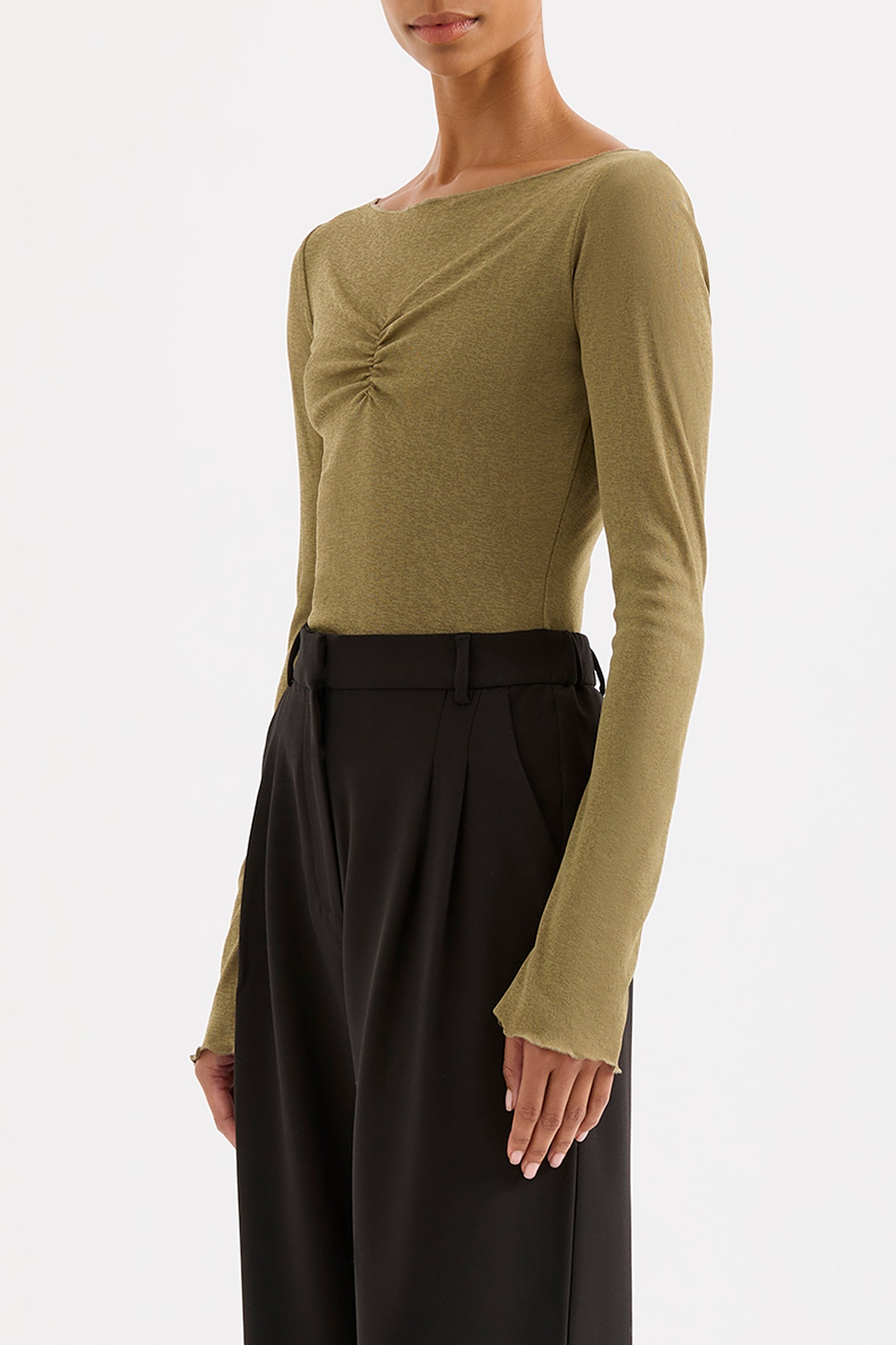 The Clement LS Top is made from a stretch jersey which has a dry hand feel. The silhouette is a flattering close fit with length finishing at the hips. Features include a boat neckline, long fitted sleeves and ruching at centre front.