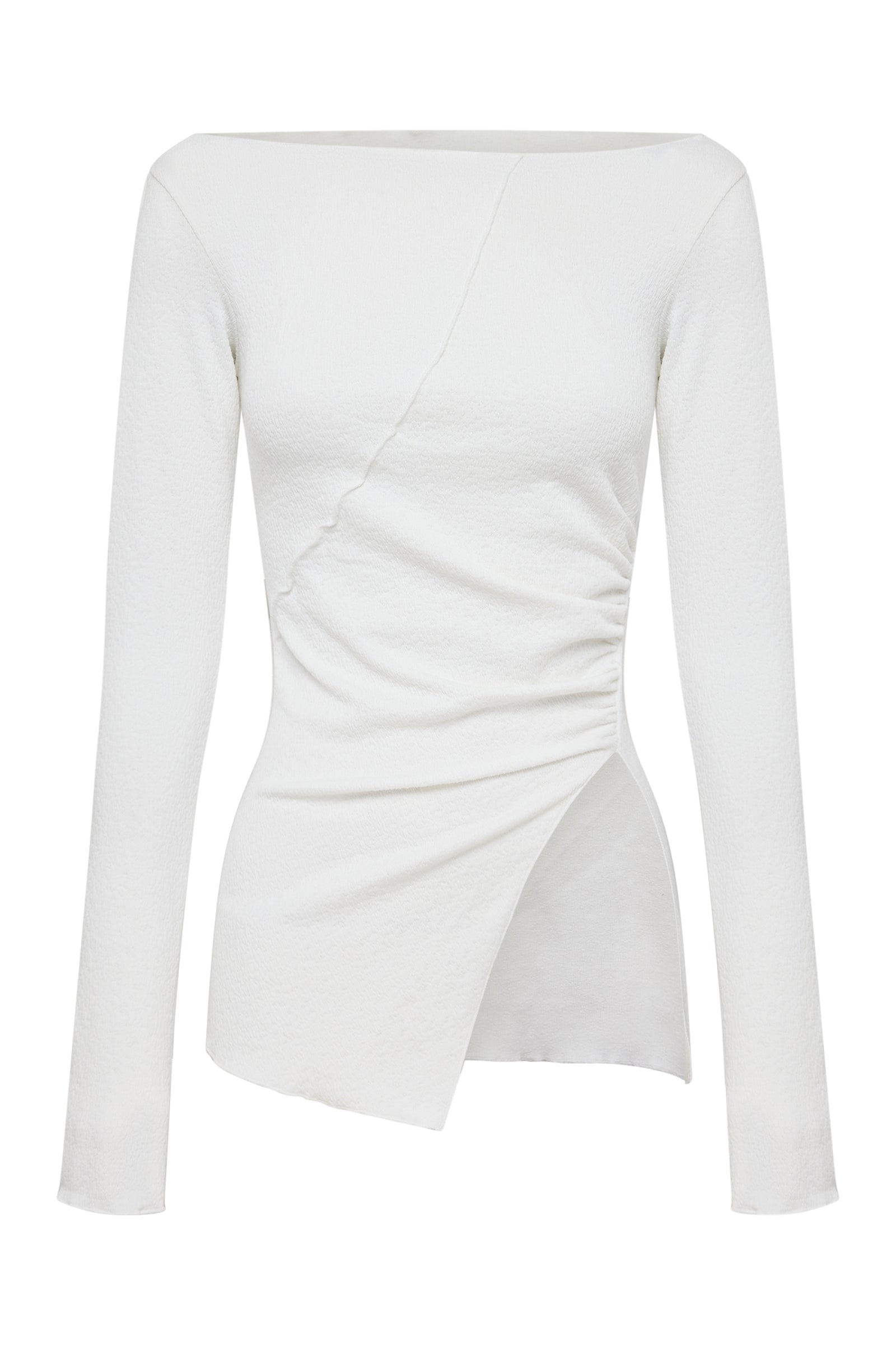 The Cora LS Top is made from a lightweight textured fabric that is stretchy and soft on the skin. The silhouette is a flattering close fit with length finishing at the hips. Features include a boat neckline, long fitted sleeves, gathering through waist, asymmetrical seam detail and side split.