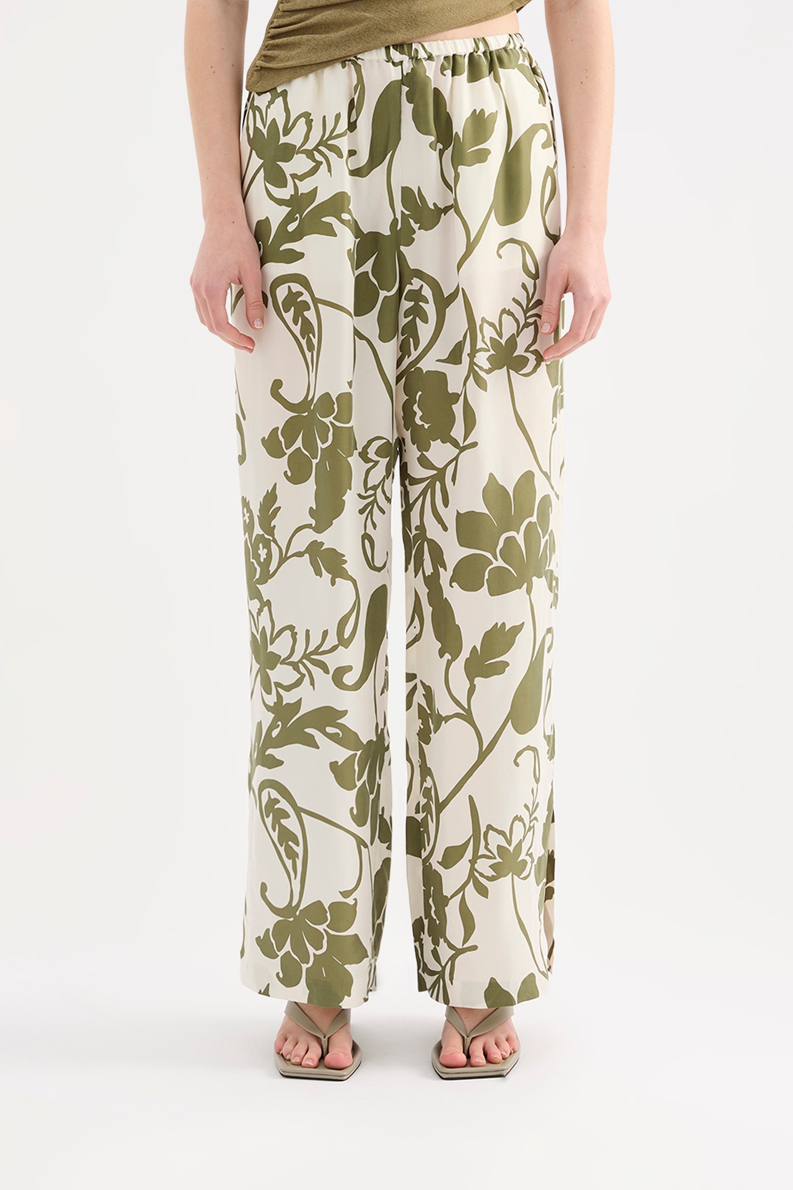 The Dahlia Cupro Pant is made in our signature cupro fabrication in our exclusive Dahlia print. The silhouette is a relaxed wide leg, full length pant. Features include an elasticated waistband, side seam pockets and slits at hem.