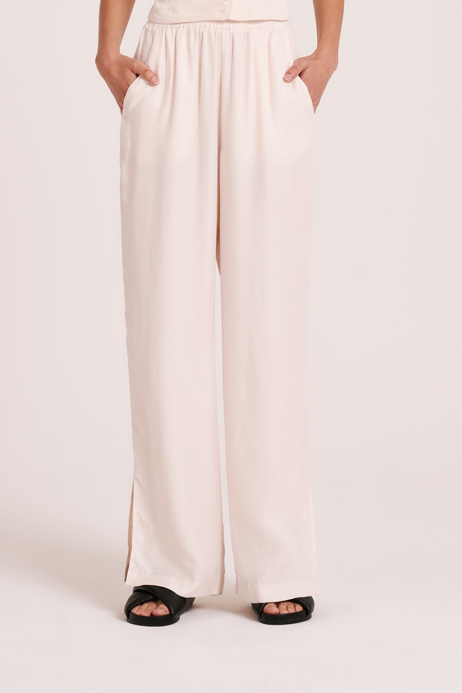 The Dara Cupro Pant in cloud is made in our signature cupro fabrication which has a soft, sueded hand feel. The silhouette is a relaxed wide leg, full length pant. Features include an elasticated waistband, side seam pockets and slits at hem.