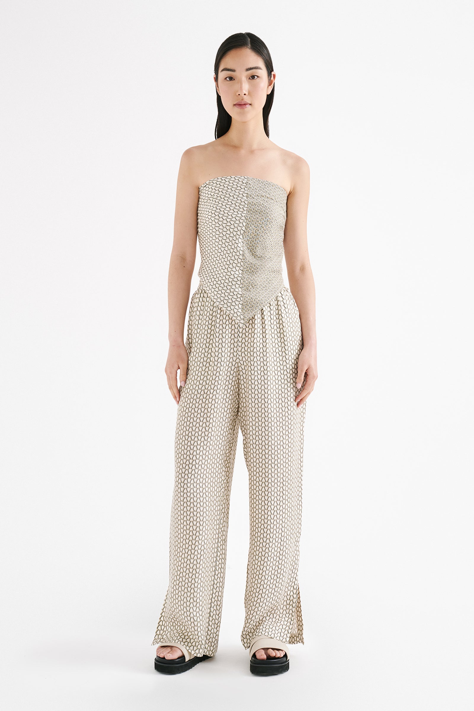 The Delphine Pant is made in our signature cupro fabrication in our exclusive Delphine print. The silhouette is a relaxed wide leg, full length pant. Features include an elasticated waistband, side seam pockets and slits at hem.