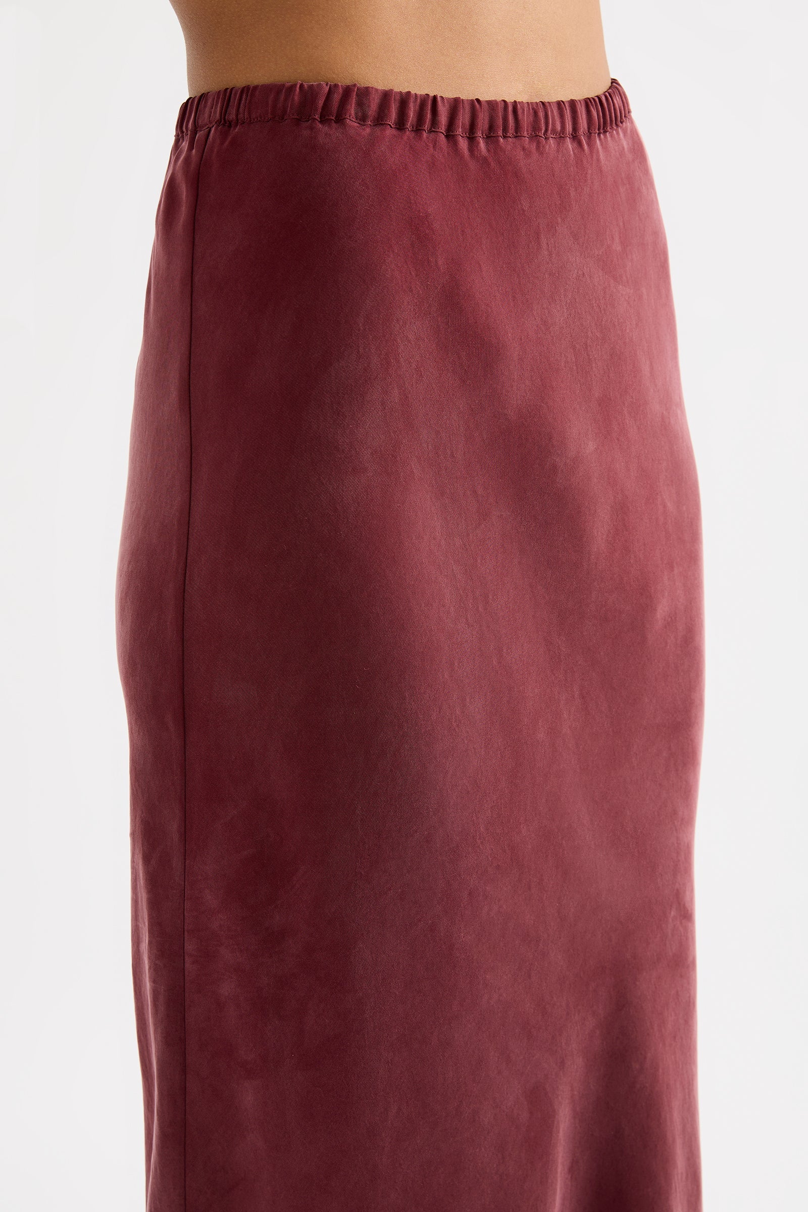 The Devin Tencel Maxi Skirt is made in a tencel blend fabrication with a soft, sueded hand feel. Cut on the bias, this silhouette finishes just above the ankles. Features include encased elasticated waistband.