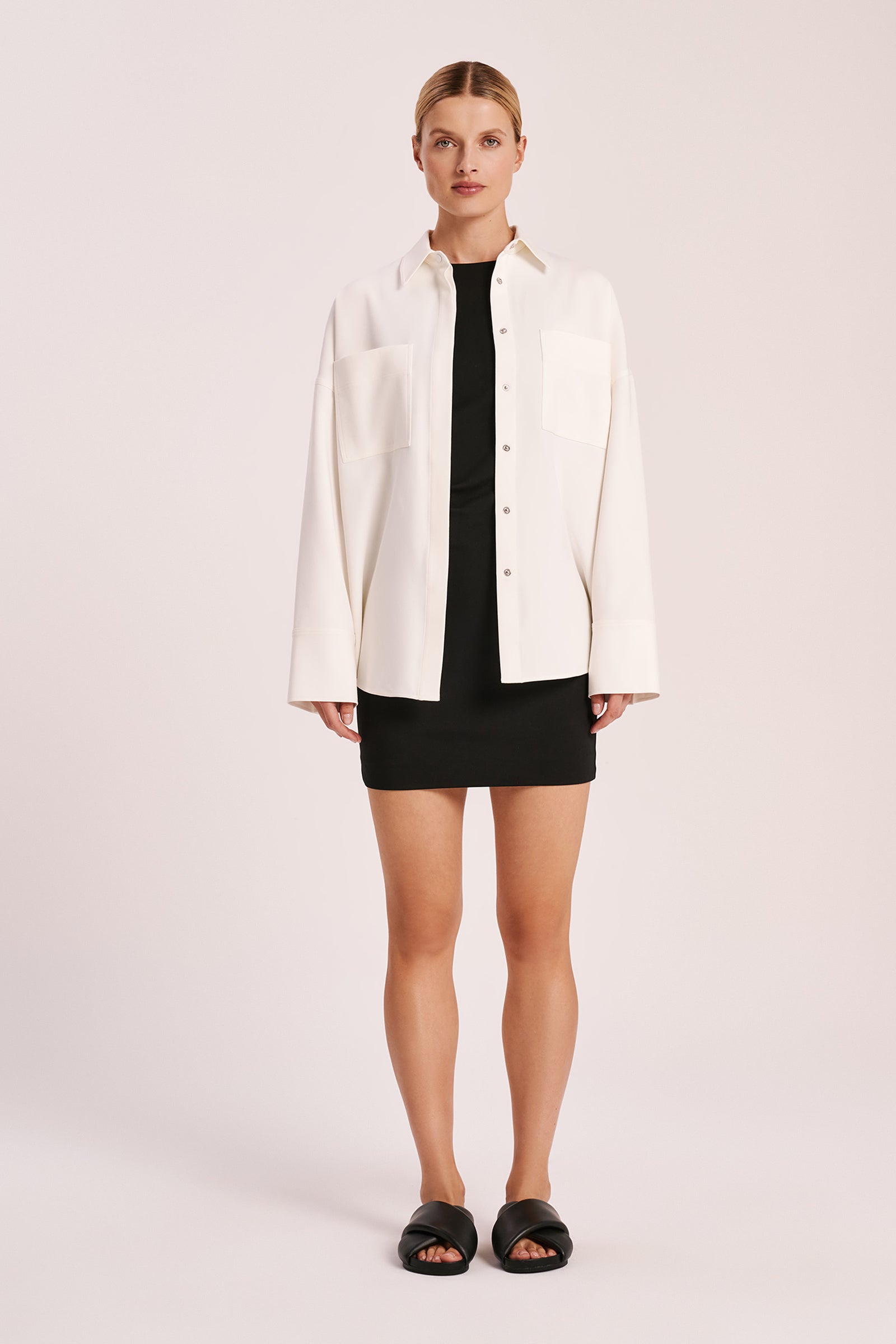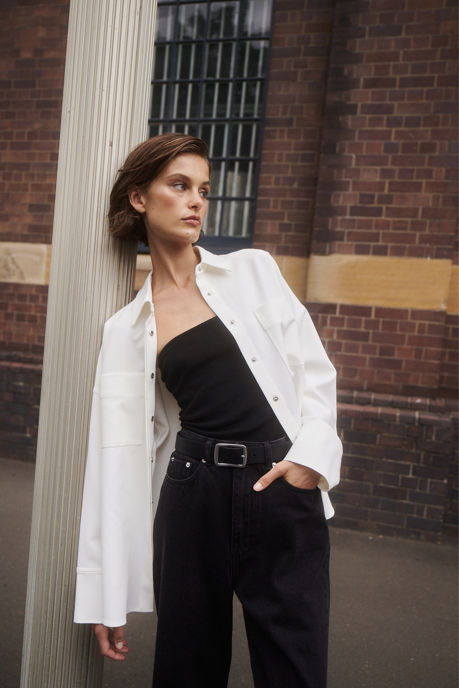 The Dorian Shacket is made from a heavyweight twill weave fabrication which has a textured hand feel. The silhouette is oversized with a drop shoulder and length finishing below the hips. Features include front patch pockets & metal press studs through centre and sleeve cuff. Wear it open as a soft jacket or layering piece.