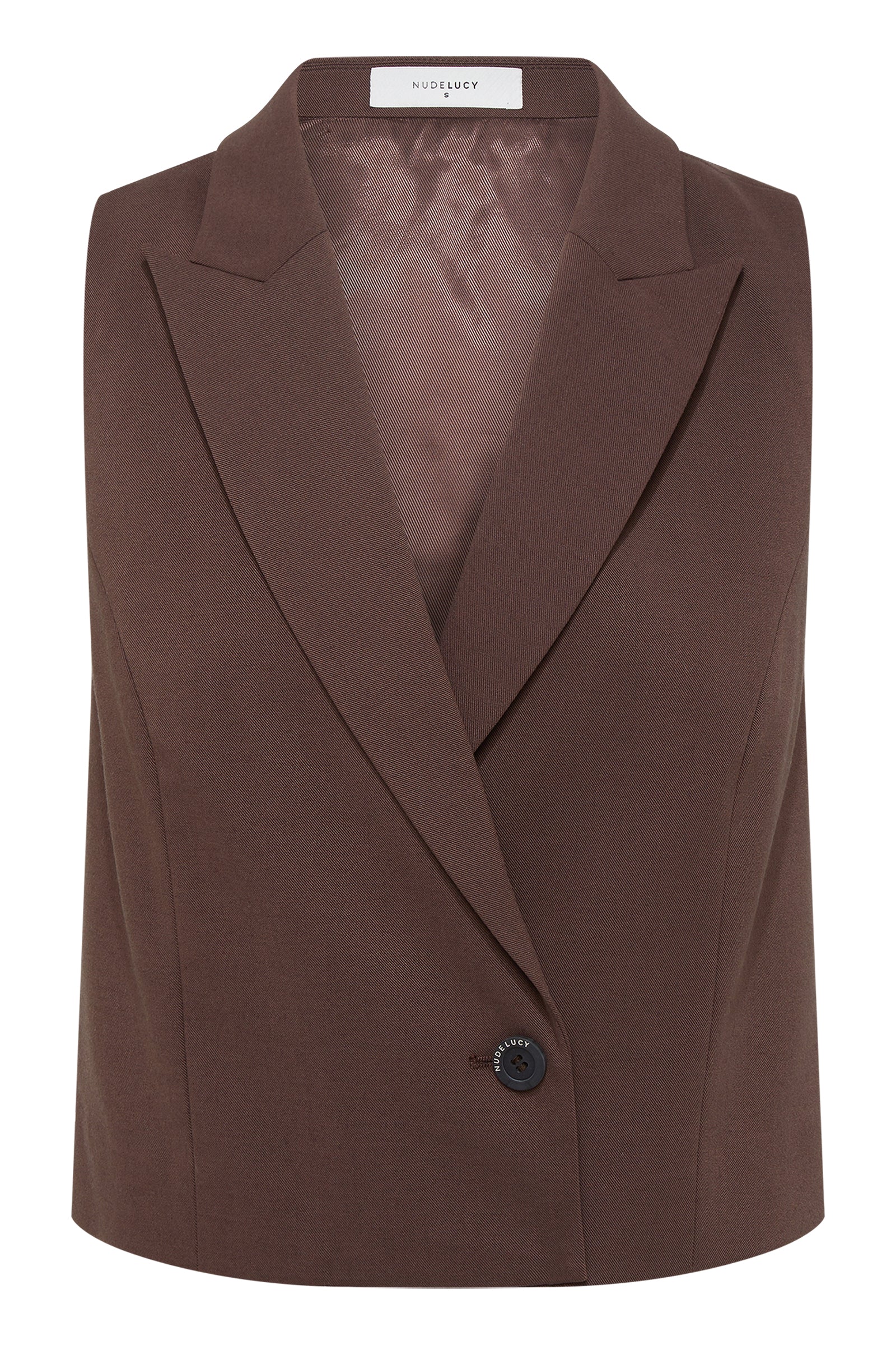 The Easton Vest is made from a classic wool blend suiting fabrication with a smooth hand feel. The silhouette is tailored and cropped with length finishing at the waist. Features include traditional tailoring features including collar and lapel, shaped panel lines and nude lucy branded button. This style is fully lined.