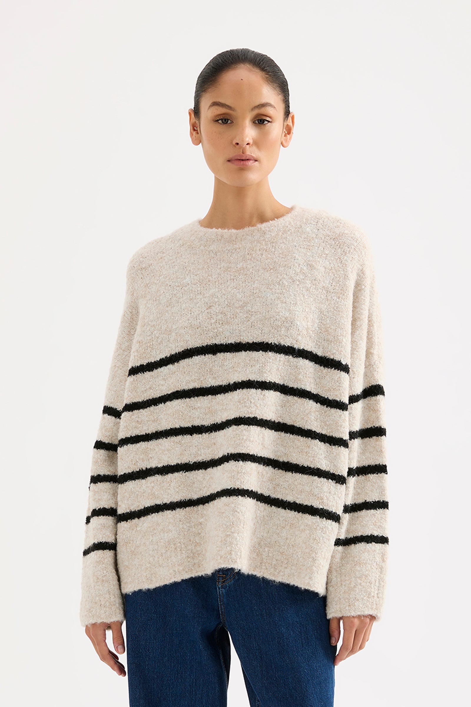 The Elias Knit is made from a recycled, heavyweight yarn which is super soft and has a slight marle effect. The fit is oversized with length finishing above the hips. Features include a crew neckline with ribbed cuff and hem.