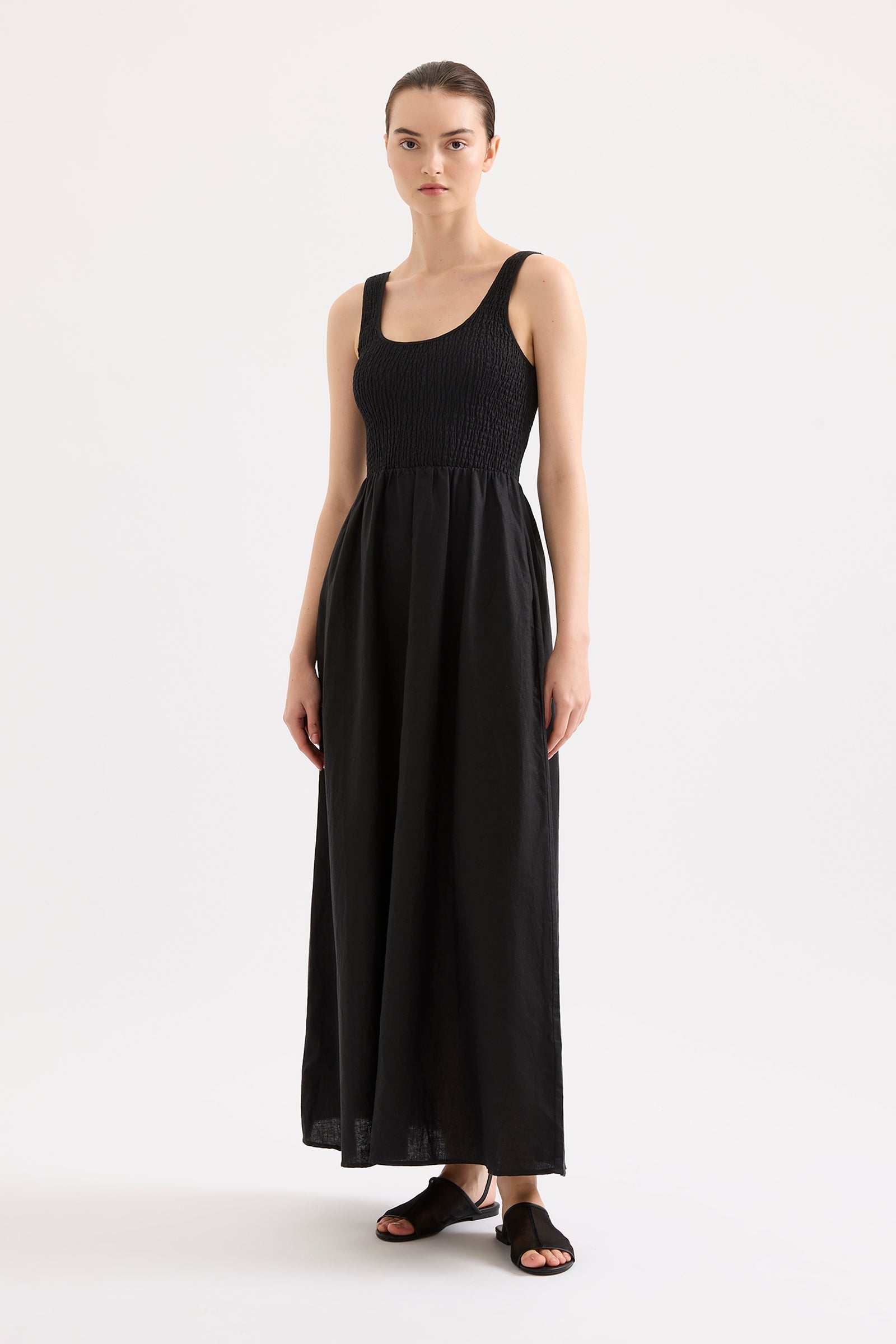 The Elio Linen Maxi Dress is made from linen cotton blend that has a soft breathable hand feel. The silhouette is feminine and relaxed with a shirred bodice and soft billowing skirt that finishes above the ankle. Features include a scooped neckline with thick straps and side seam pockets..