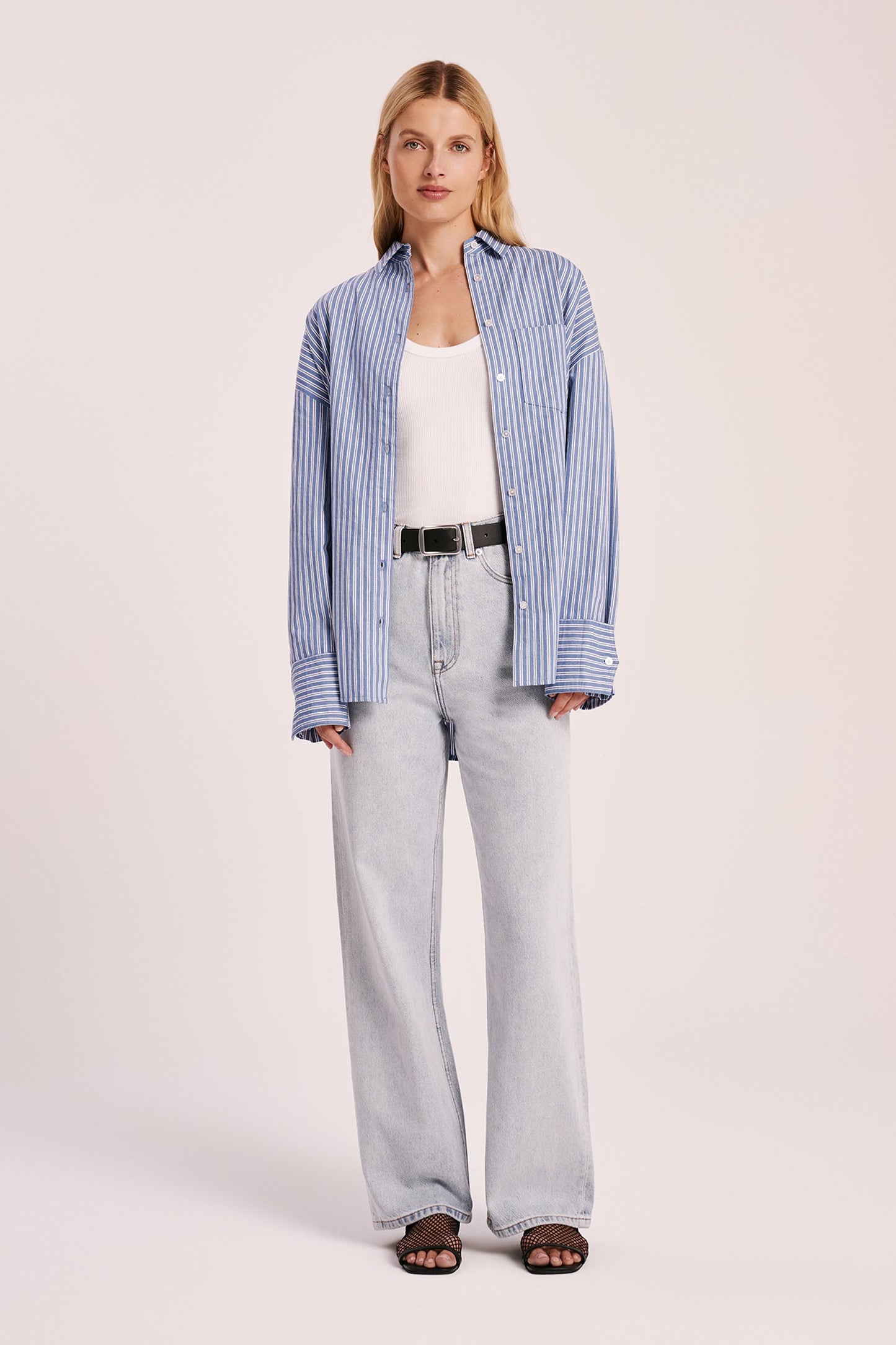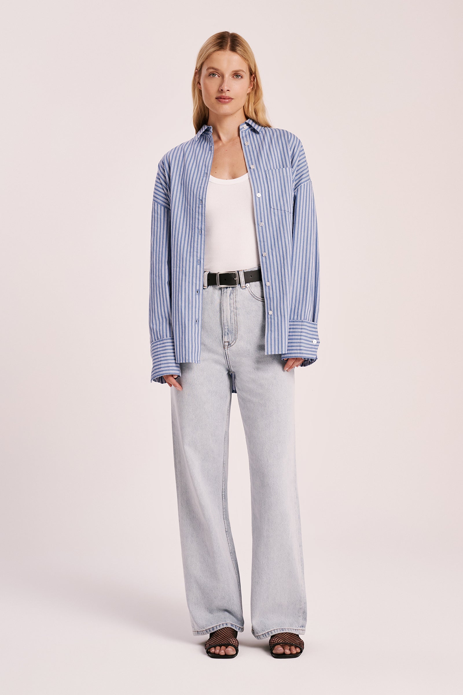 The Emerson Shirt is made from a heavy weight cotton poplin which has a soft peached hand feel. The silhouette is oversized throughout with length finishing on the hips. Features include front patch pockets, a large cuff and large shell buttons.