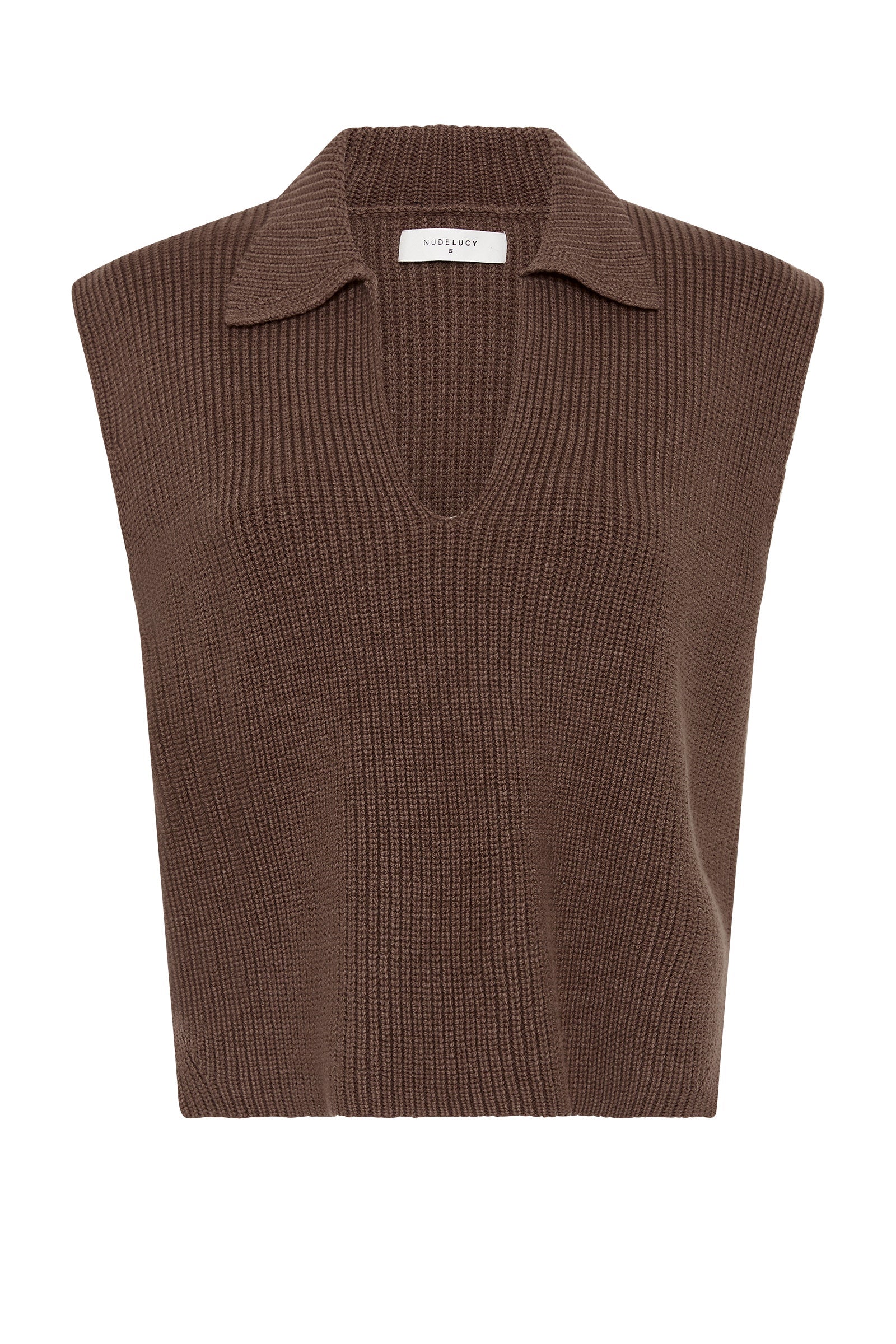 The Enes Knit Vest is made from a mid-weight chunky yarn with a dry hand feel. The silhouette is relaxed finishing at the hips. Features include a fully knitted rugby collar and a ribbed stepped hem with side slits.