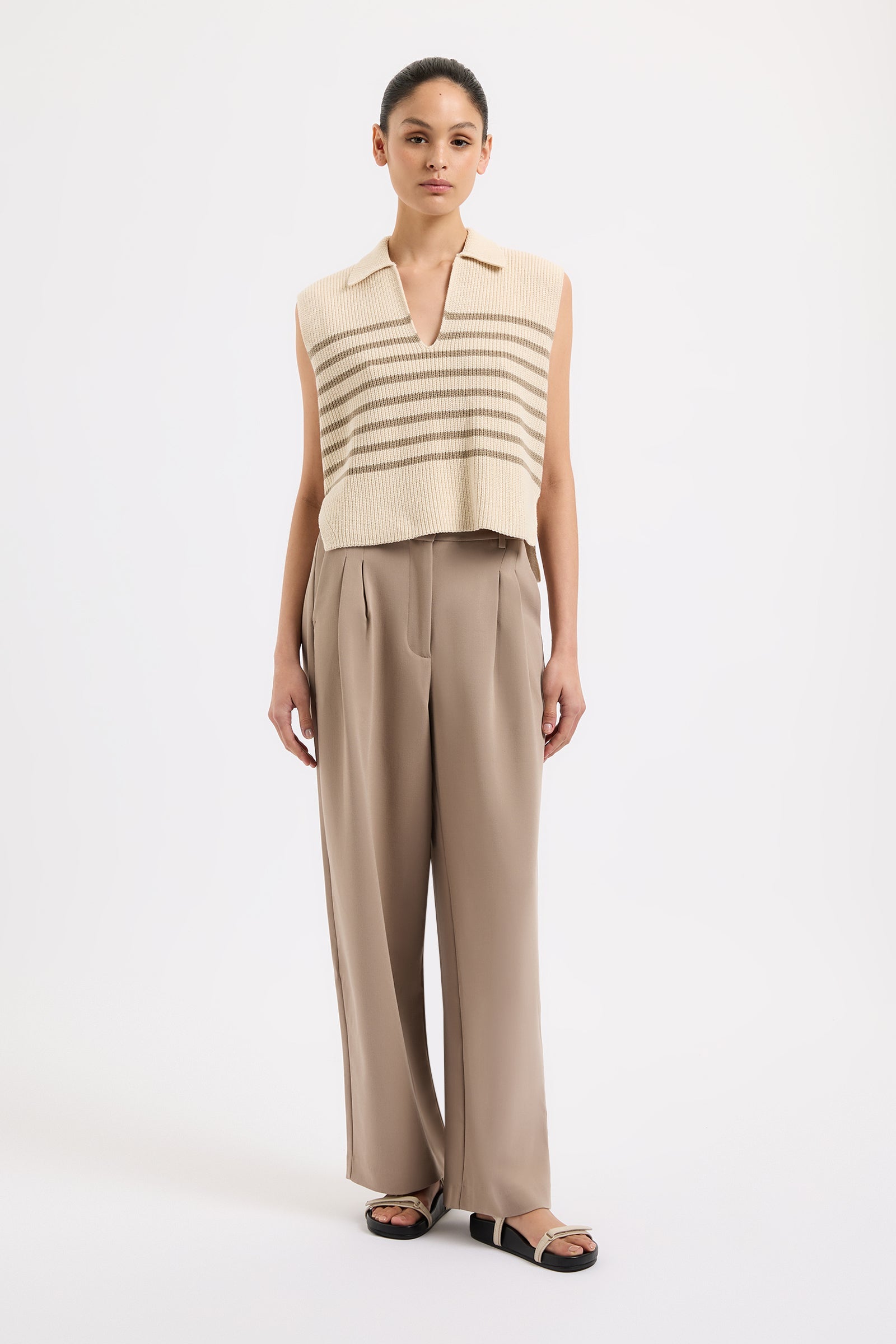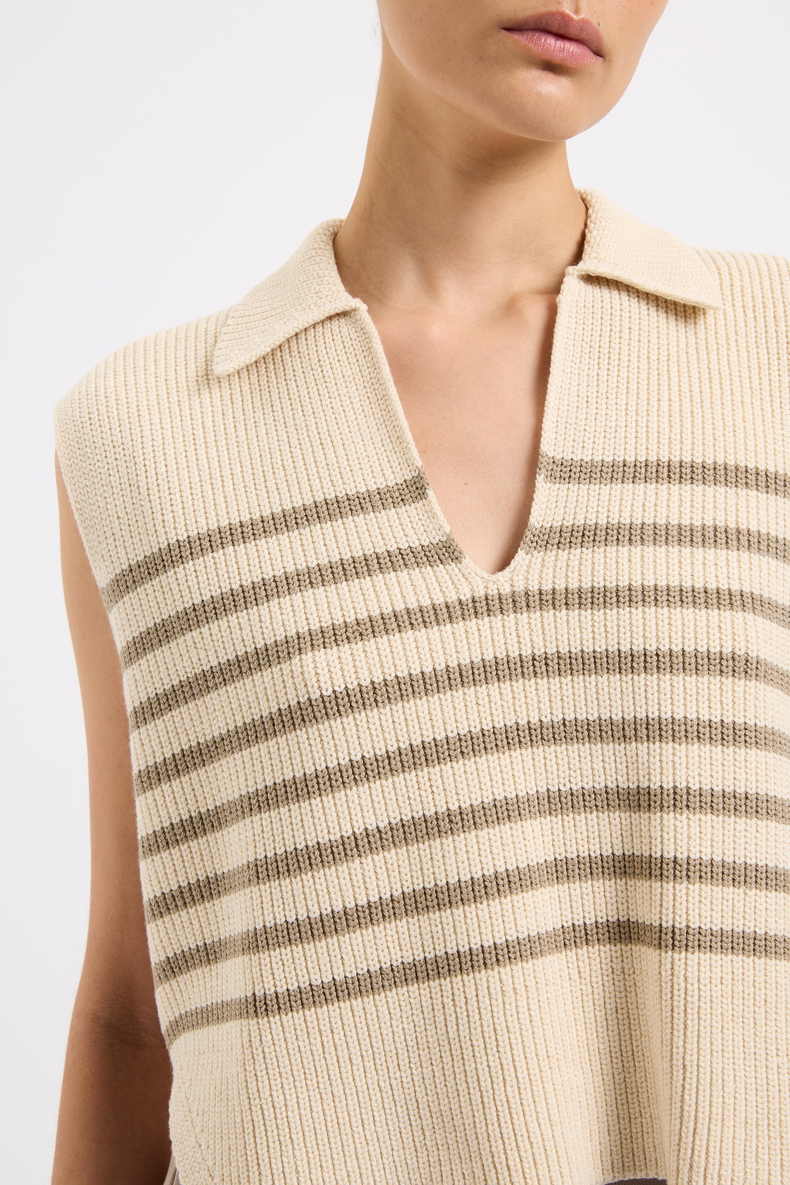 The Enes Knit Vest is made from a mid-weight chunky yarn with a dry hand feel. The silhouette is relaxed finishing at the hips. Features include a fully knitted rugby collar and a ribbed stepped hem with side slits.