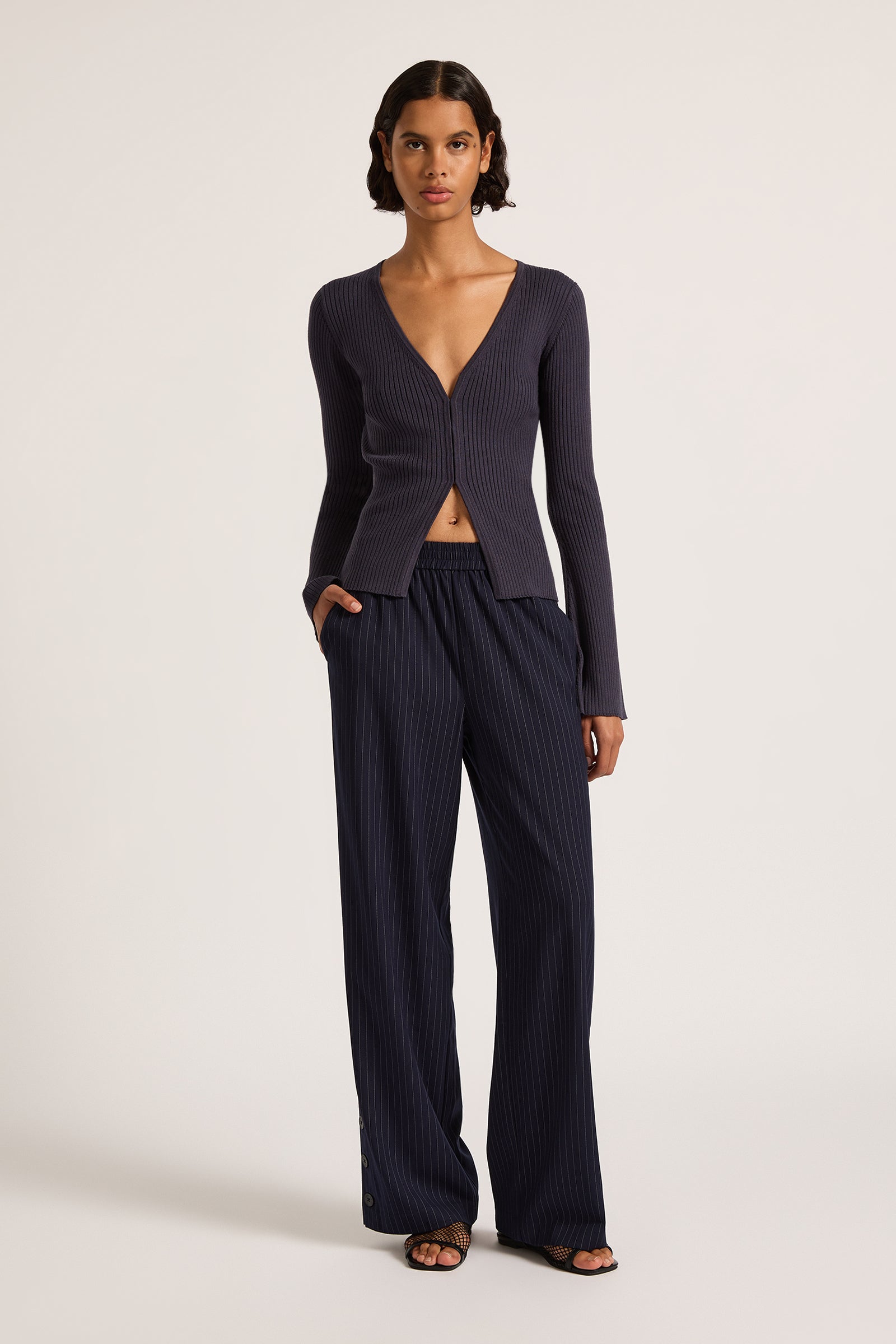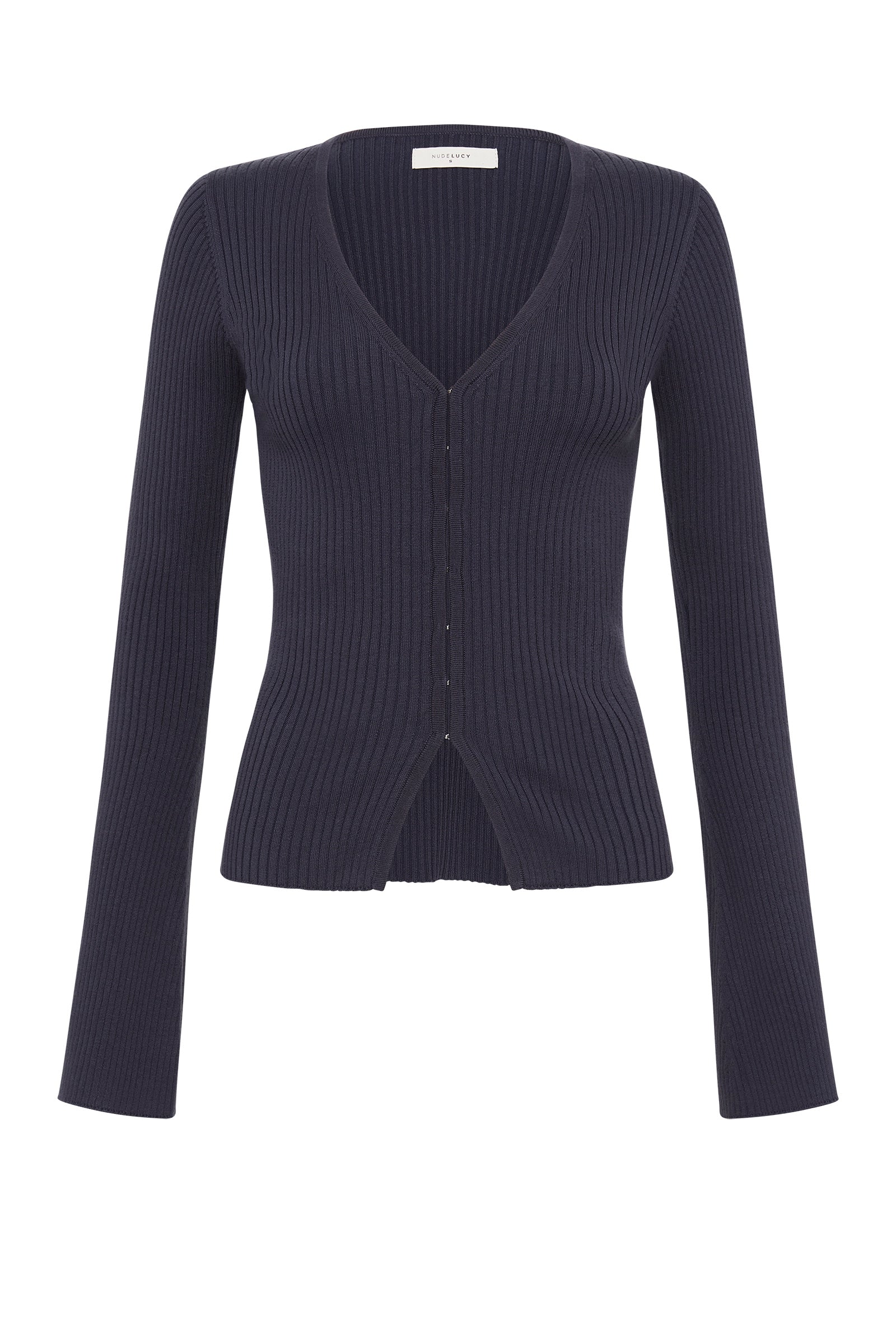 The Ettiene Knit Cardigan is made from a cotton blend yarn which has a ribbed, soft hand feel. The silhouette is fitted to the body with long, flared sleeves and length finishing above the hips. Features include V-neck and hook and eye opening at centre front.