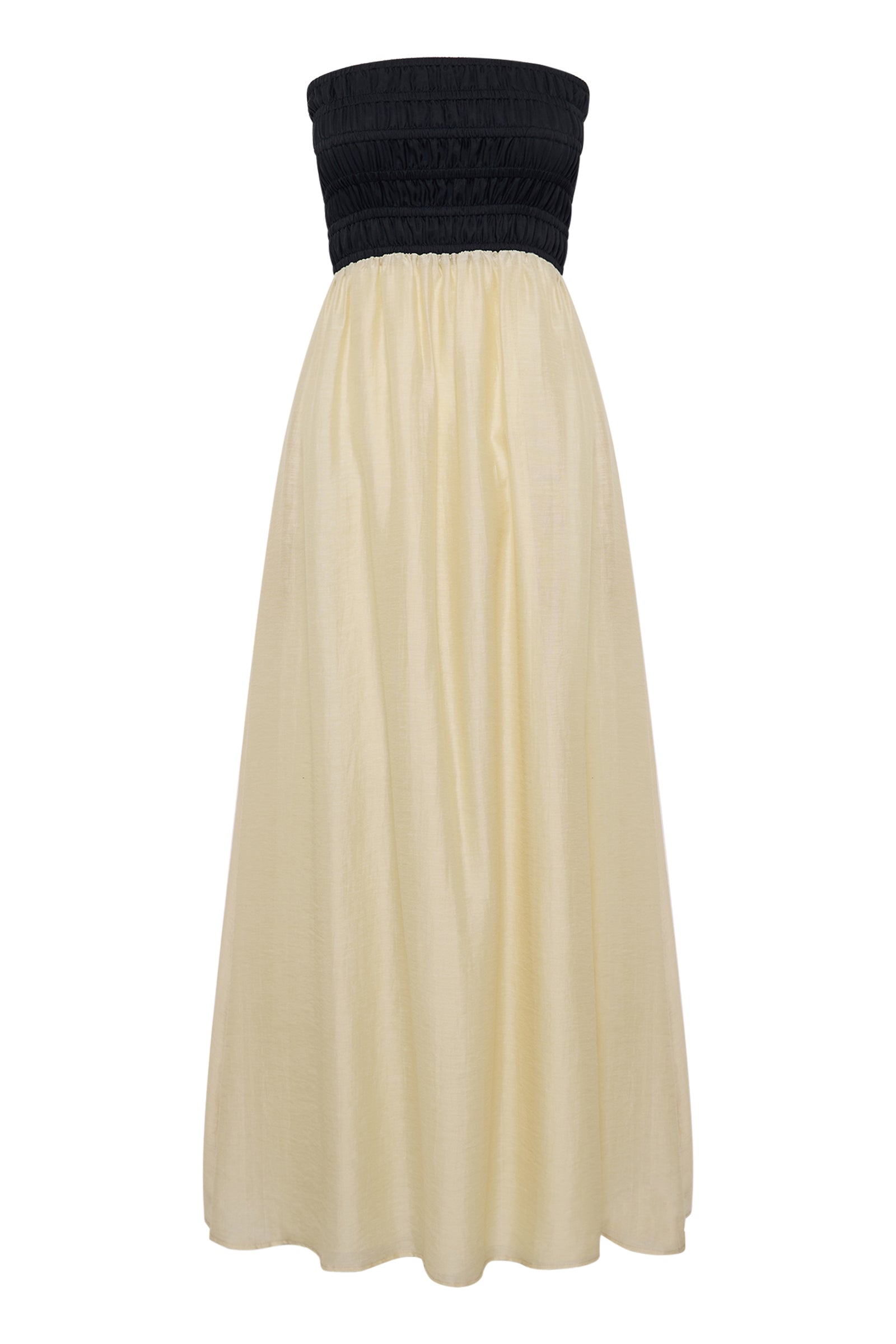 The Frances Shirred Maxi Dress is made from a linen cotton blend that has a soft breathable hand feel. The shape is in our best selling silhouette which is feminine and relaxed with a strapless, shirred elasticated bodice and soft billowing skirt that finishes above the ankle. Features include chamomile and black splicing, side seam pocket and side splits at the hem.