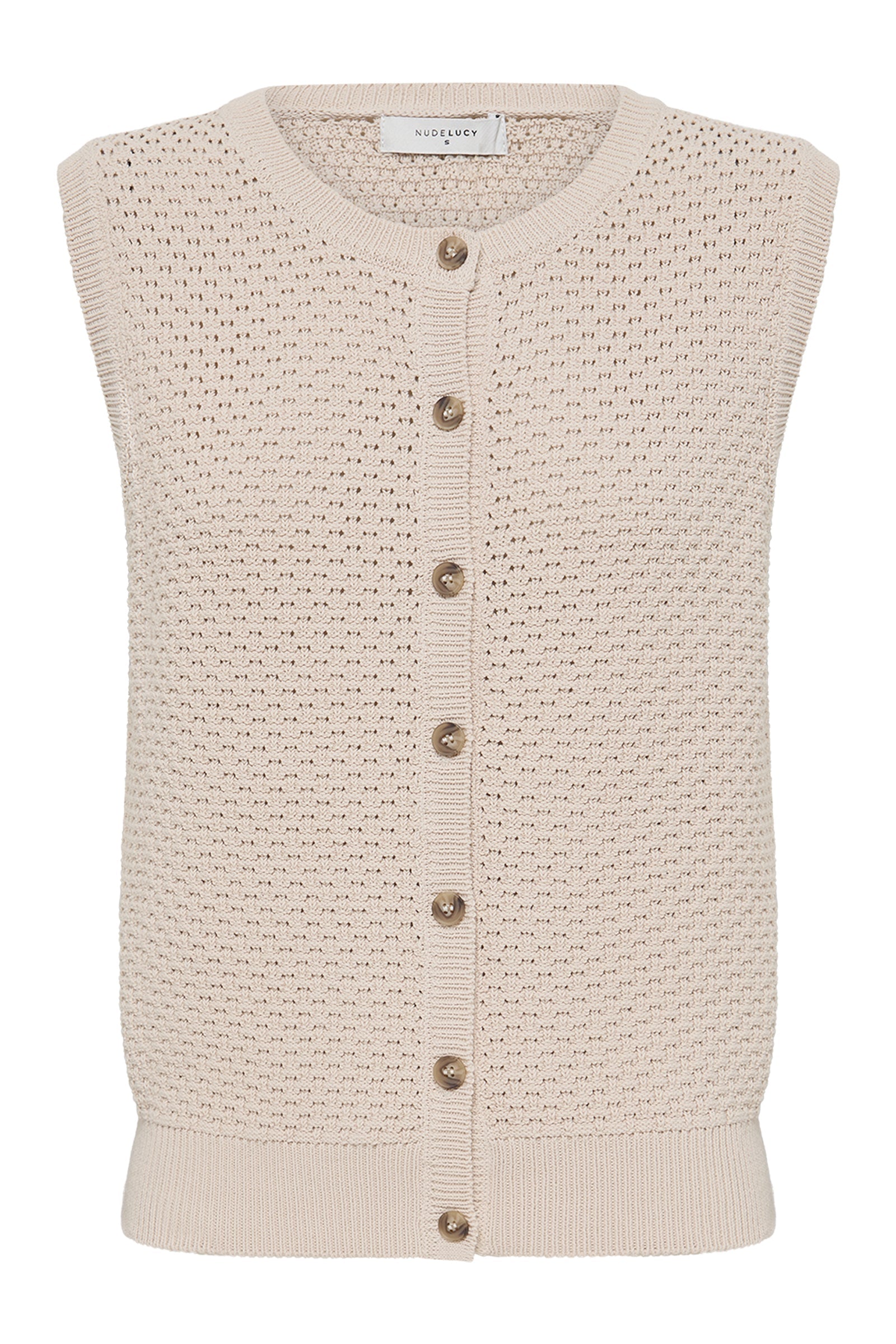 The Frazer Knit Tank is made from a cotton blend yarn with a soft, dry hand feel and a textured knit construction. The silhouette is relaxed, with length finishing above the waist. Features include a crew neckline, tortoiseshell buttons, centre front button opening and soft rib neckline, hem and armholes.