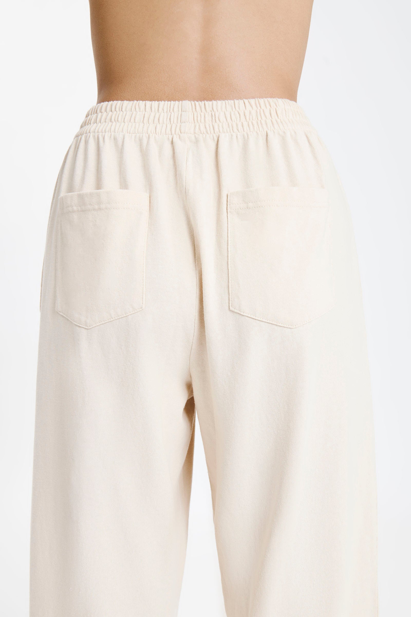 Cut in a premium 100% cotton jersey with a heavyweight but breathable handfeel. The Fresno Pant is a relaxed silhouette with a wide leg shape and length finishing above the ankle. Features include an encased elastic waistband with topstitch detail, front pockets and back patch pockets.