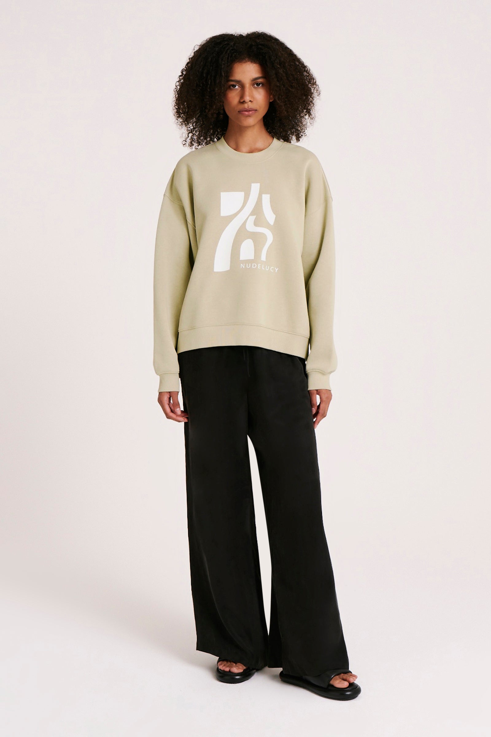 The Goya Sweat is made from washed fleece with an ultra soft hand feel. The  silhouette is an oversized crew featuring a ribbed neckline, hemline and cuffs with top stitching finishes. Features include exclusive print designed in house on front chest.
