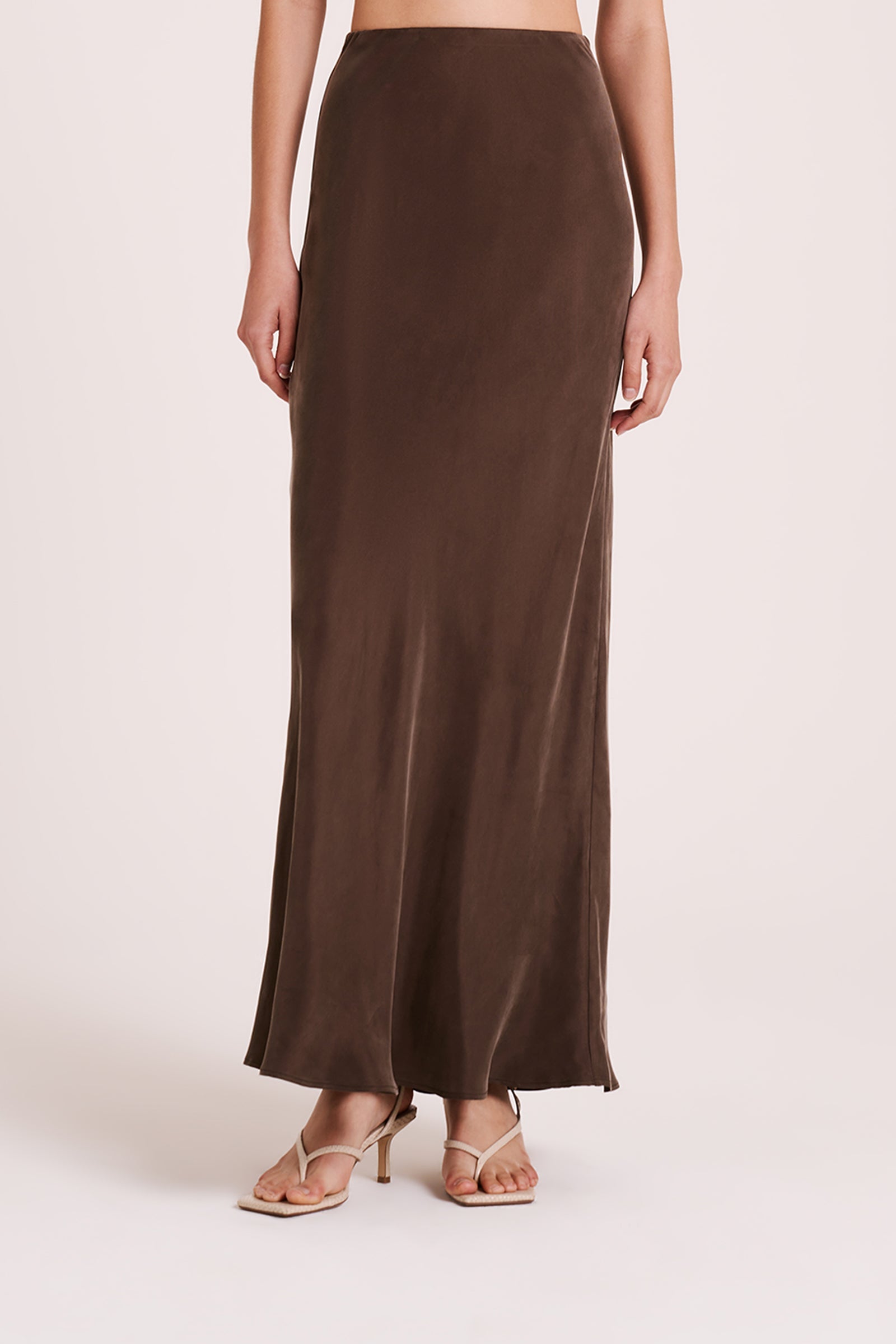 The Ines Cupro Skirt in bark is made in our signature cupro fabrication, with a soft, velvety hand feel. Cut on the bias, this skirt finishes ankle length and drapes over the body softly. Features include an encased elasticated waistband.