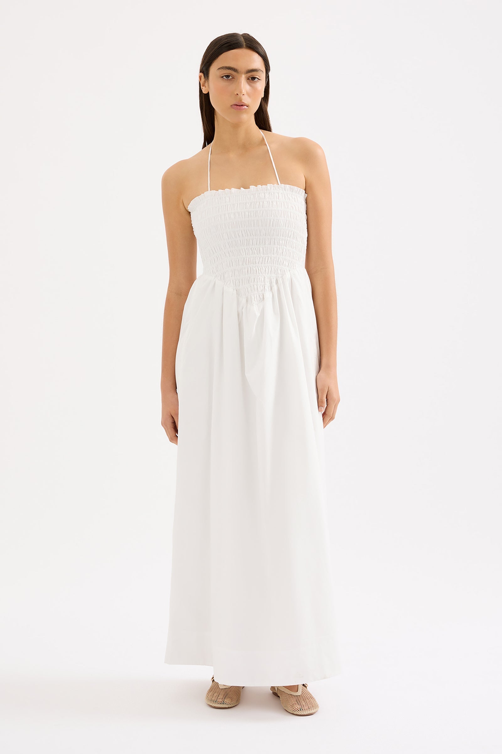 The Inka Maxi Dress is made from a cotton poplin which has be washed for a smooth, crisp hand feel. The silhouette is feminine and relaxed with a shirred elasticated bodice and soft billowing skirt that finishes above the ankle. Features include halter tie and side splits at the hem.