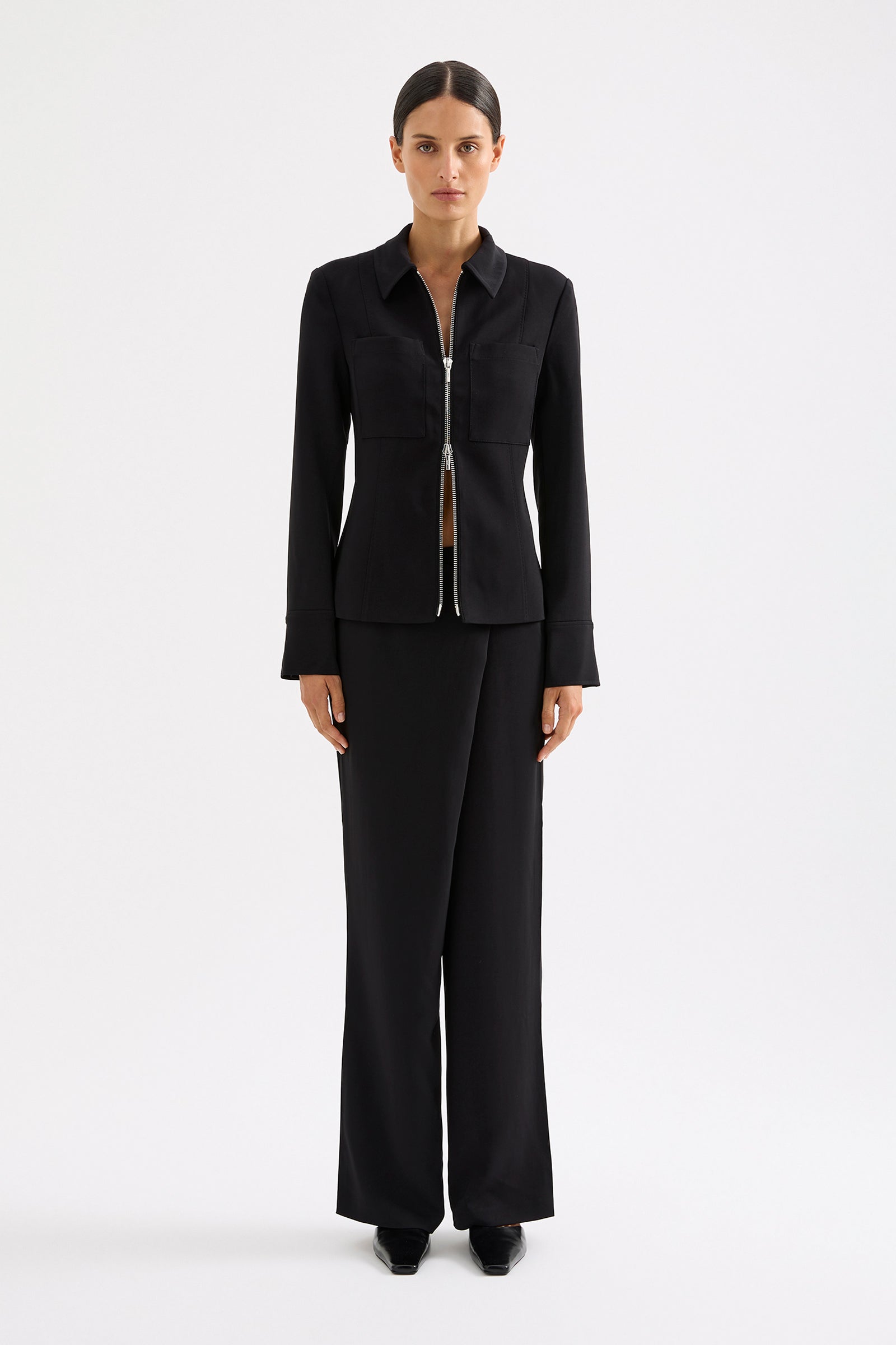 The Isra Jacket is made from a premium tailoring fabrication with a dry handfeel. The silhouette is tailored to fit the body with long sleeves and length finishing at low hip. Features include exposed centre front zipper with branded NiLs zipper puller and snap buttons, paneling, back vent and front patch pockets. This jacket is fully lined.