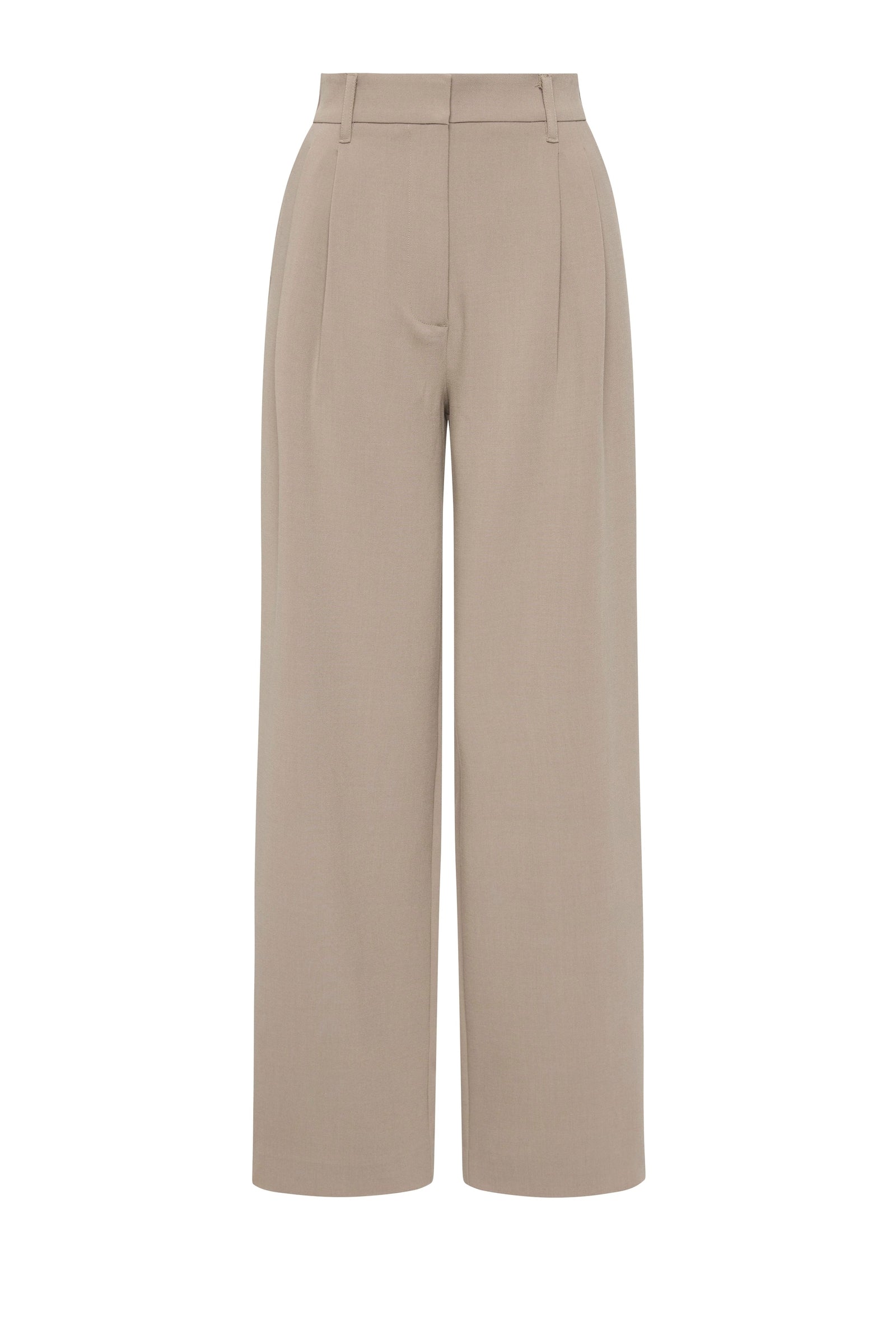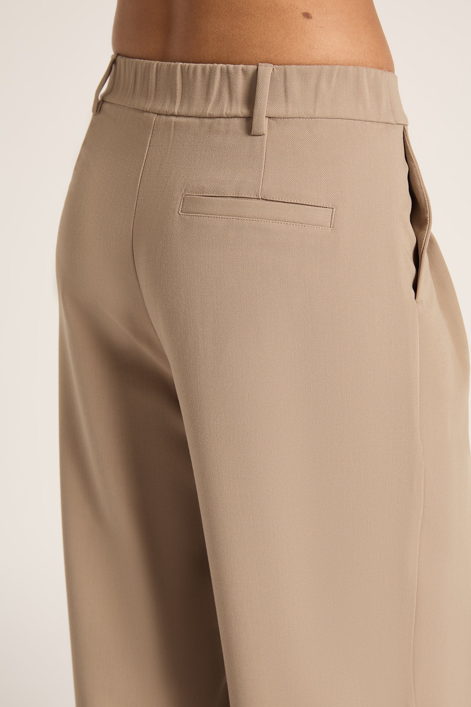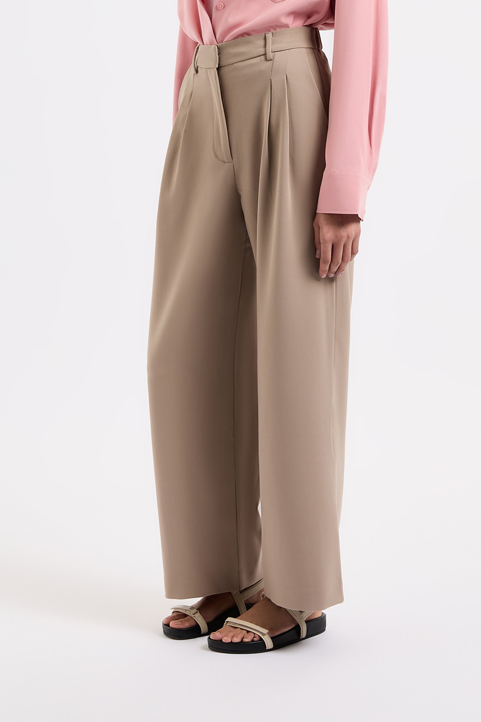 The Jiro Tailored Pant is made from a classic suiting fabrication with a smooth hand feel. The silhouette is a tailored fit with a high rise waist and tapered leg. Features include front pleats at waist, internal elastic at back waistband & concealed button and trouser hook closure.