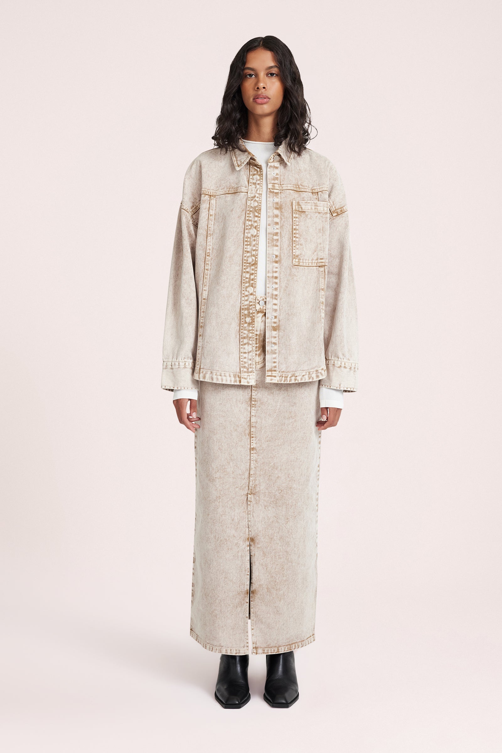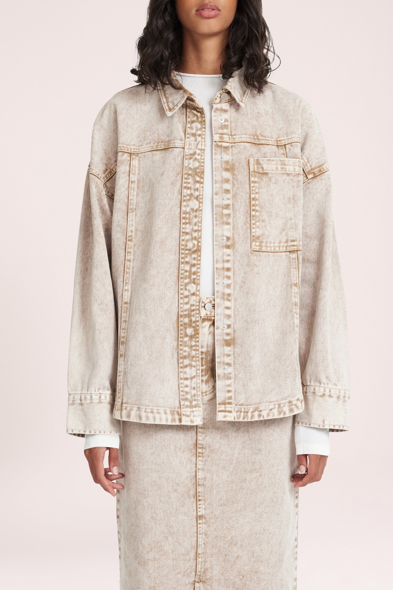 The Kollins Jacket is made from a heavyweight cotton twill which has an acid snow wash effect. The silhouette is relaxed with a dropped shoulder and length finishing below the hips. Features include snap buttons and front patch pocket.