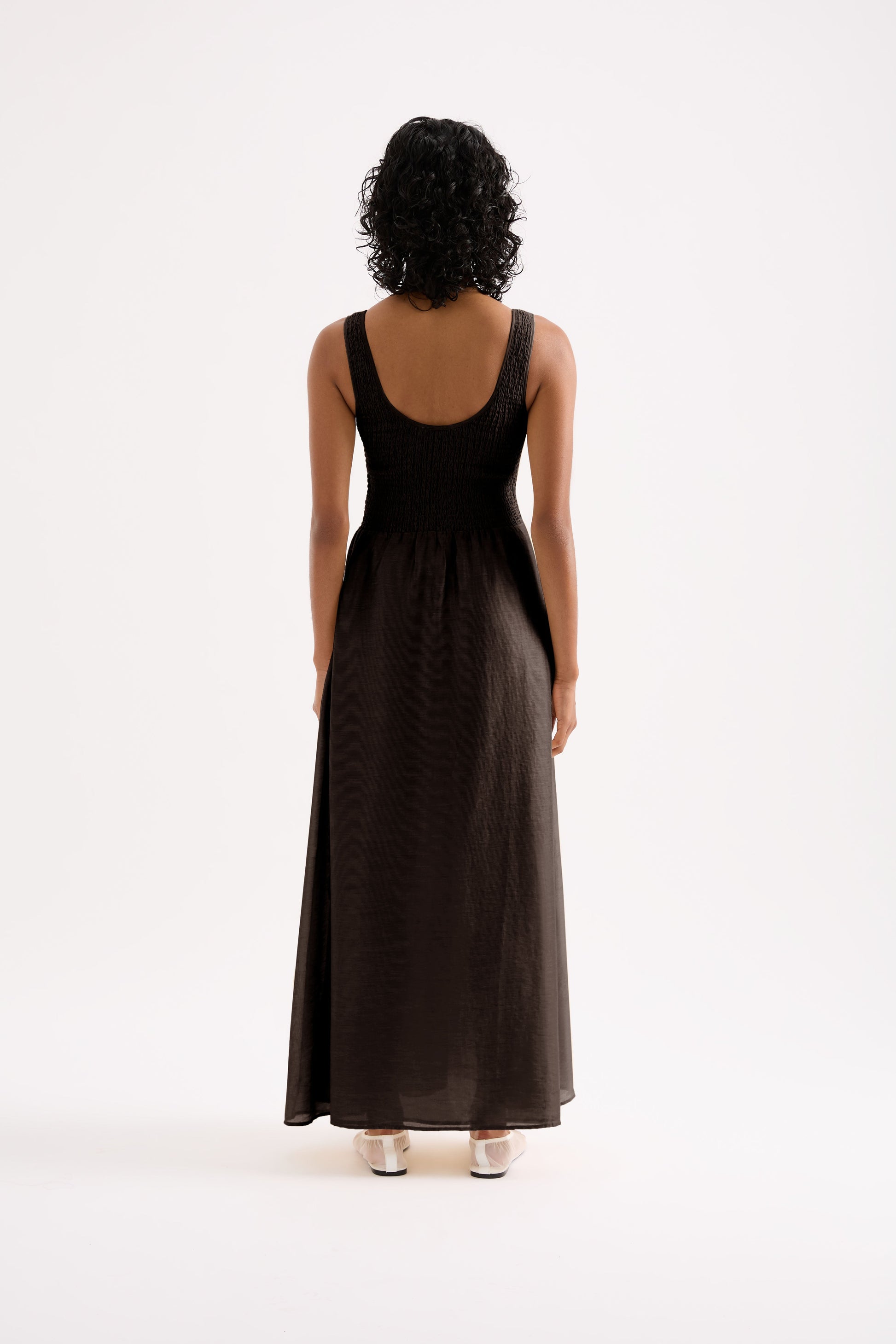The Kova Maxi Dress is made from a light weight lyocell blend fabric which is slightly sheer and has a smooth hand feel. The silhouette is feminine and relaxed with a shirred bodice and soft billowing skirt that finishes above the ankle. Features include a scooped neckline with thick straps. This dress is fully lined.