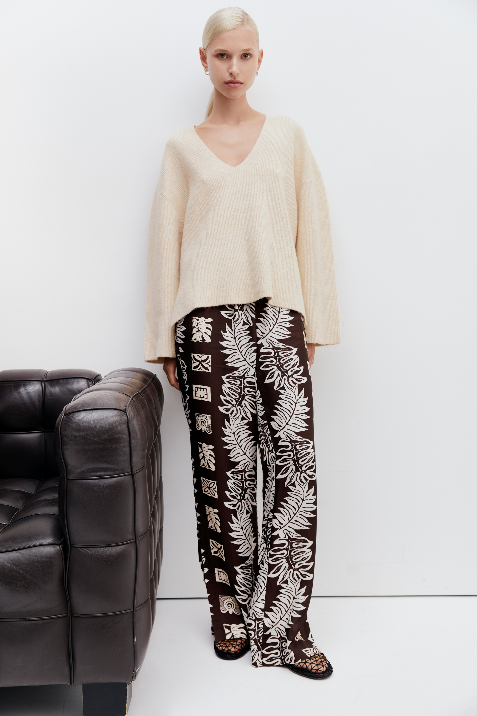 The Lago Cupro Pant is made from our signature cupro fabrication in our exclusive Tortuga print. The silhouette is a relaxed wide leg, full length pant. Features include a an elasticated waistband, side seam split and side seam pockets