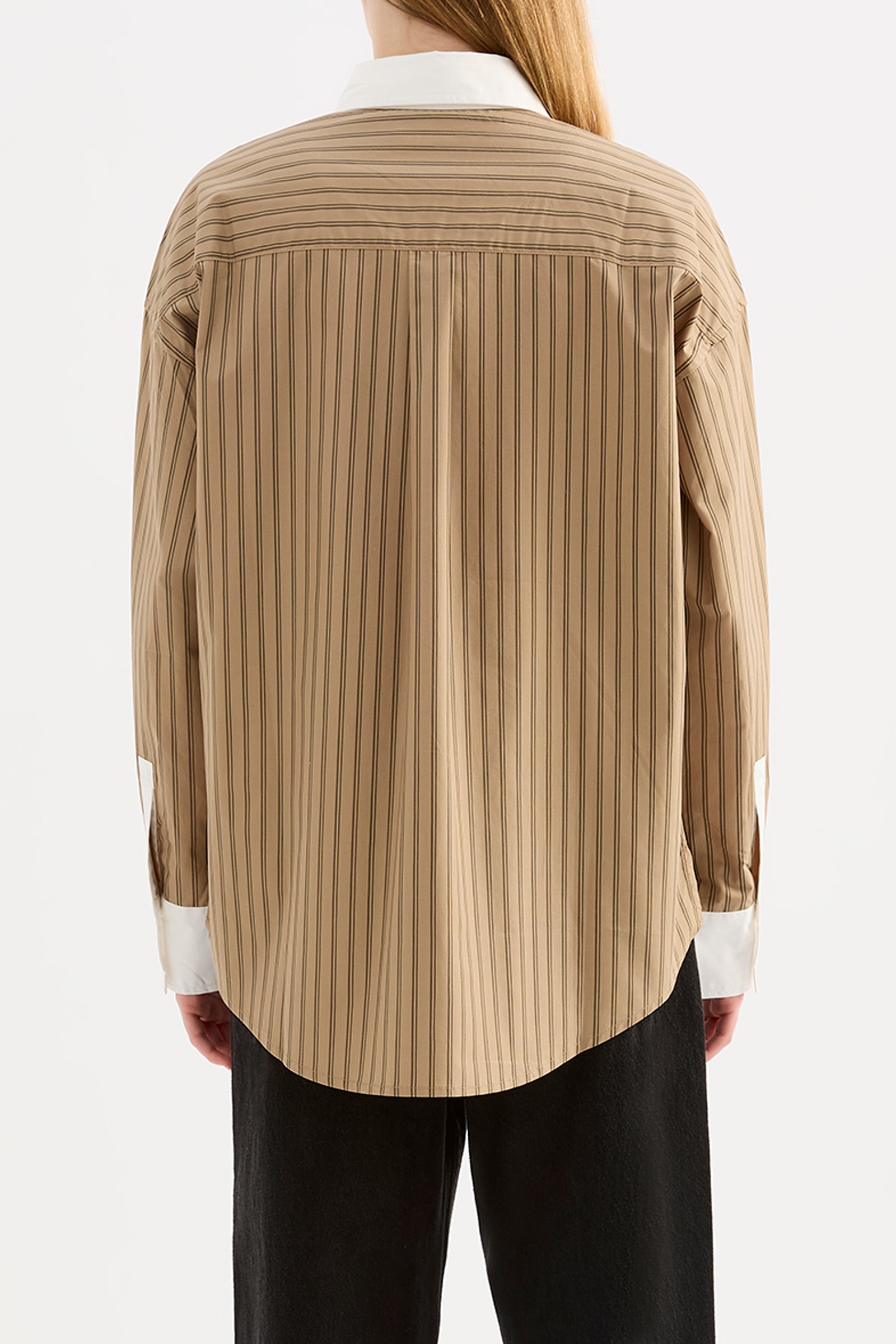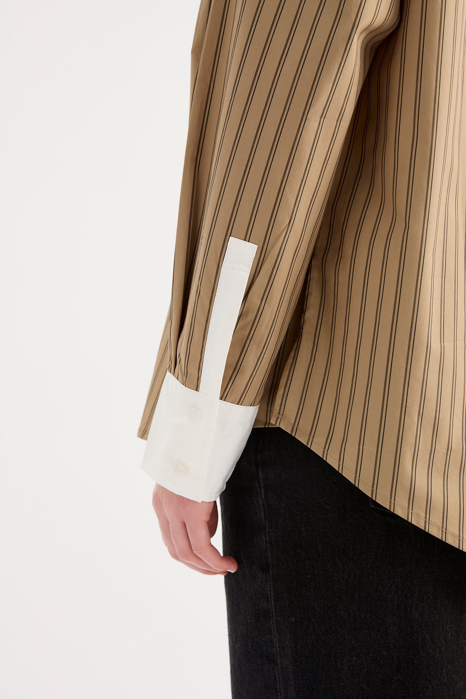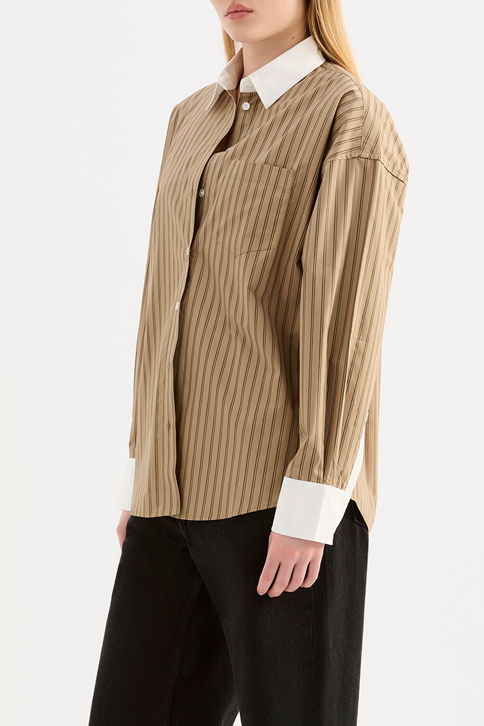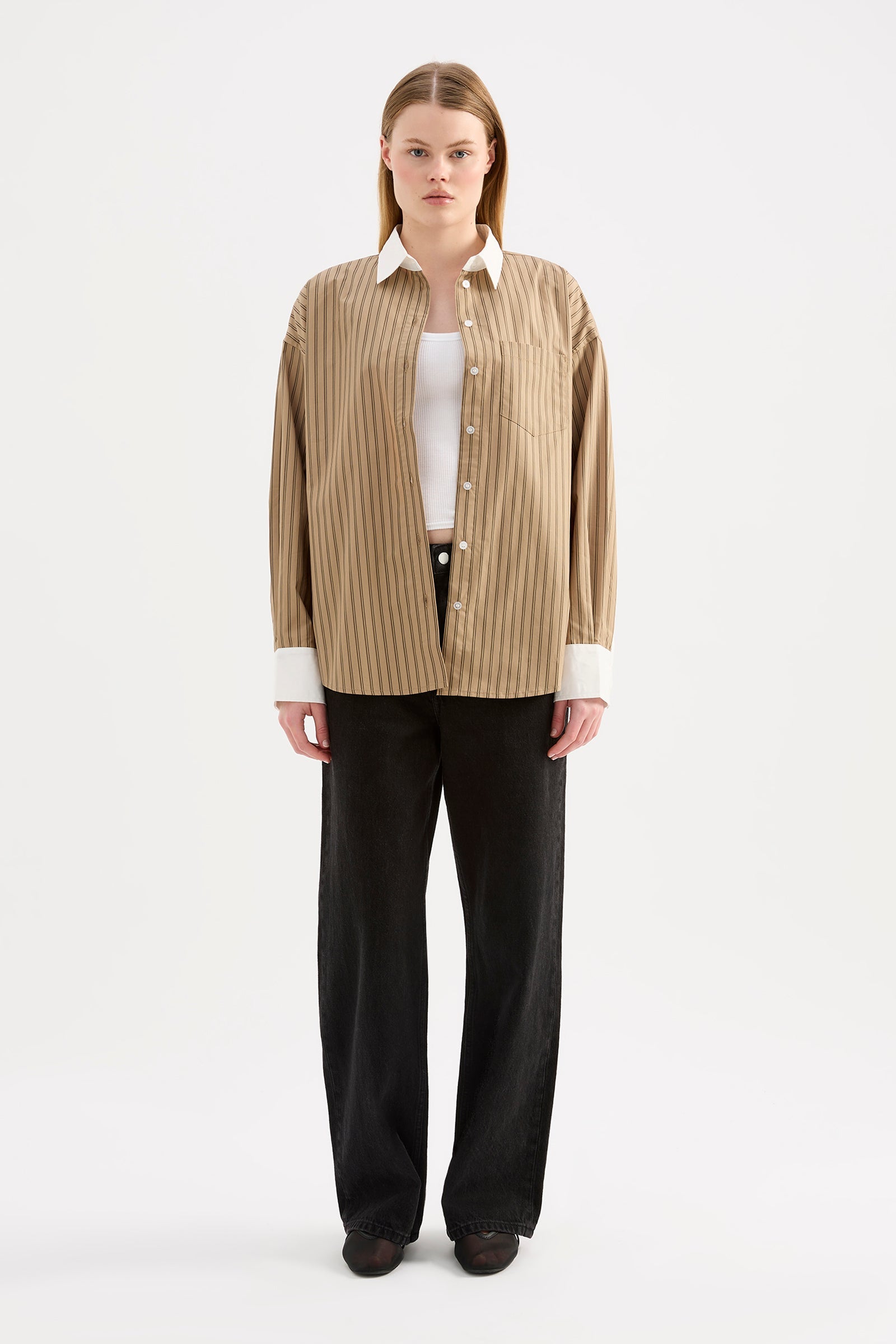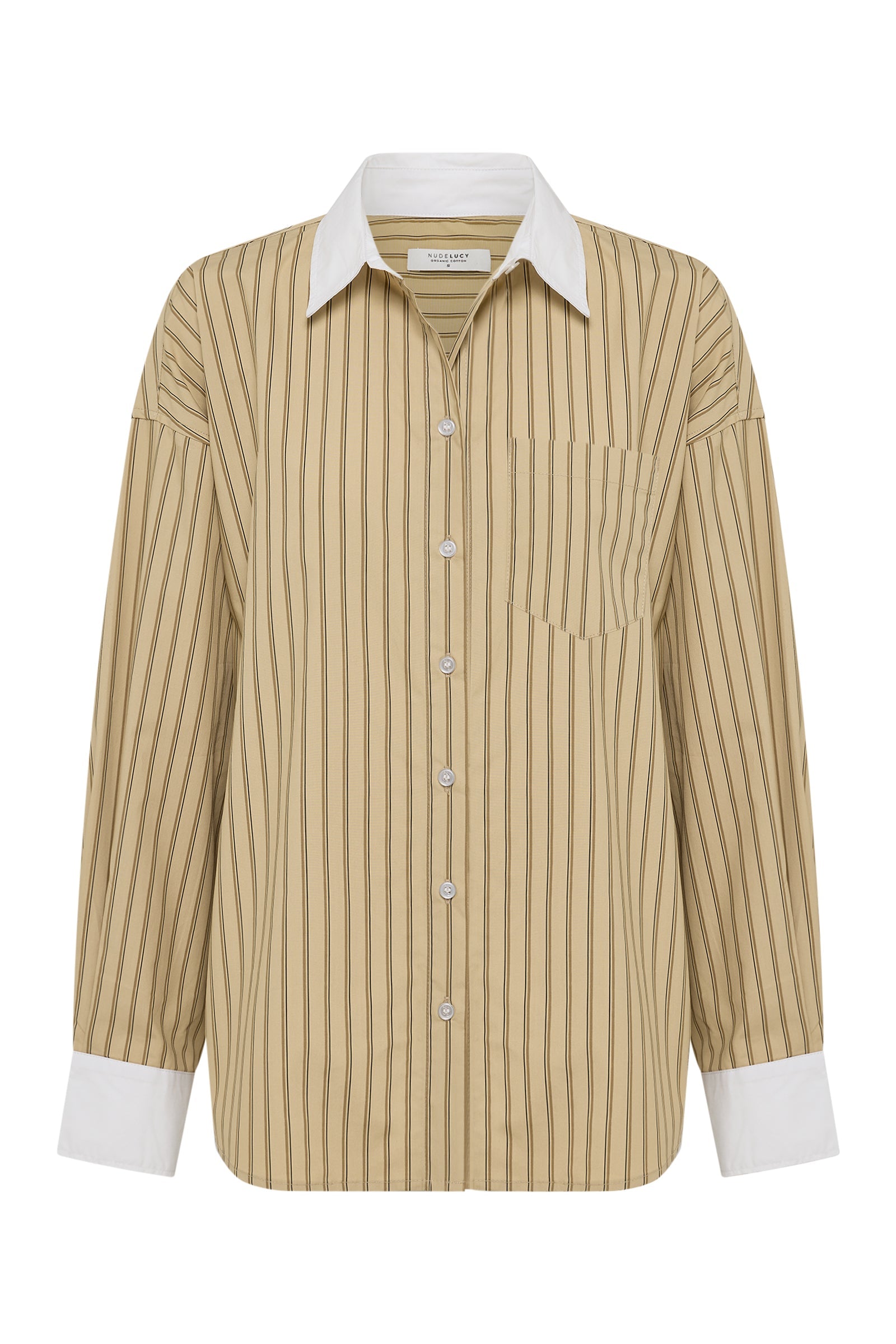 The Lando Shirt is made from a organic cotton poplin which has been washed for a smooth, crisp hand feel.  The silhouette is oversized throughout with length finishing on the hips. Features include front patch pockets, a large cuff and Nude Lucy branded buttons.