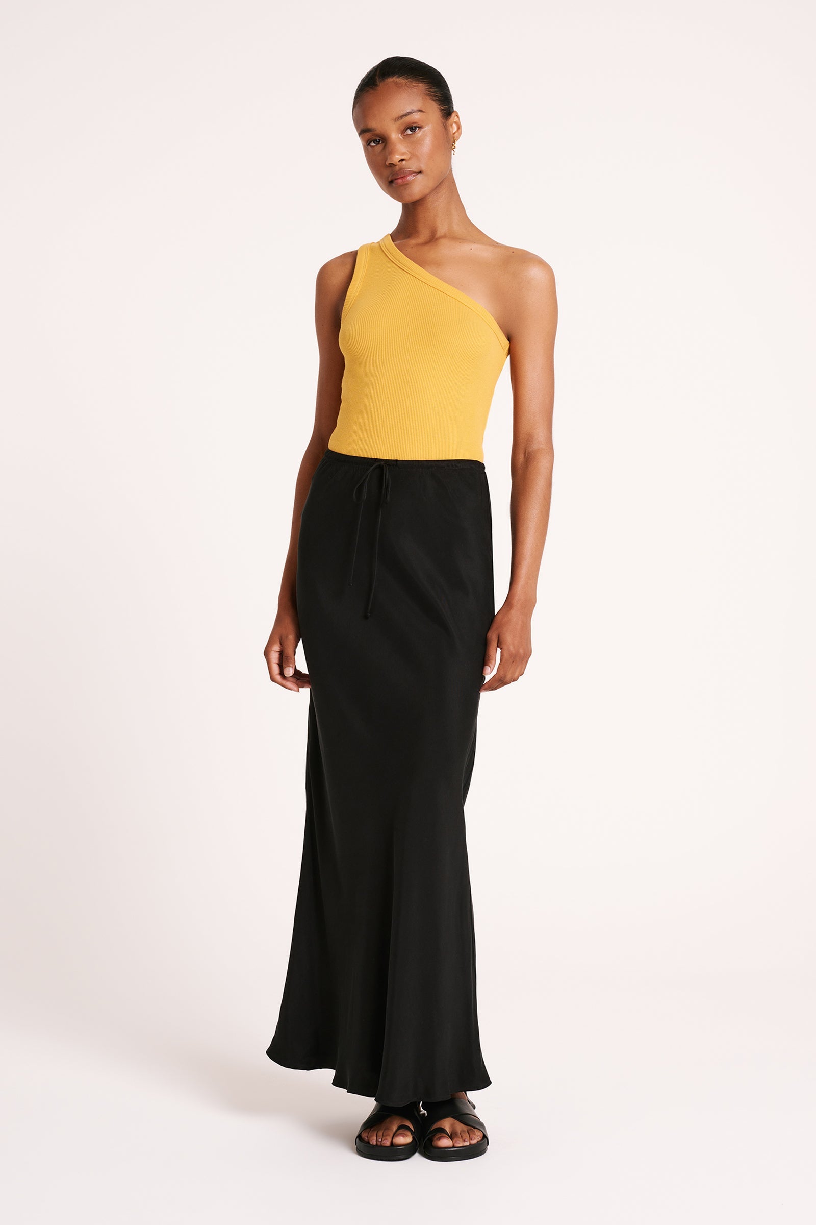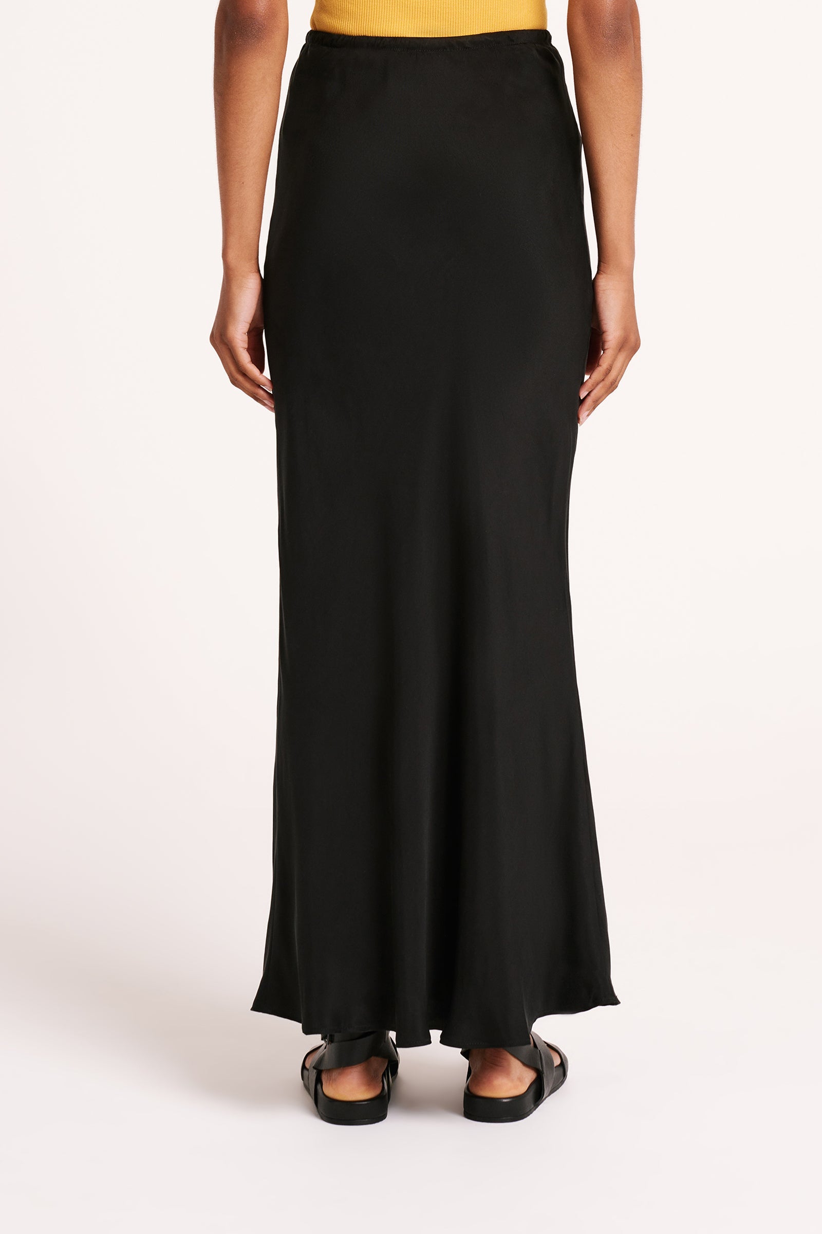 The Lea Cupro Skirt in black is made in our signature cupro fabrication which has a soft, sueded hand feel. Cut on the bias, this silhouette finishes just above the ankles. Features include encased elasticated waistband with a self cut draw string at centre front.
