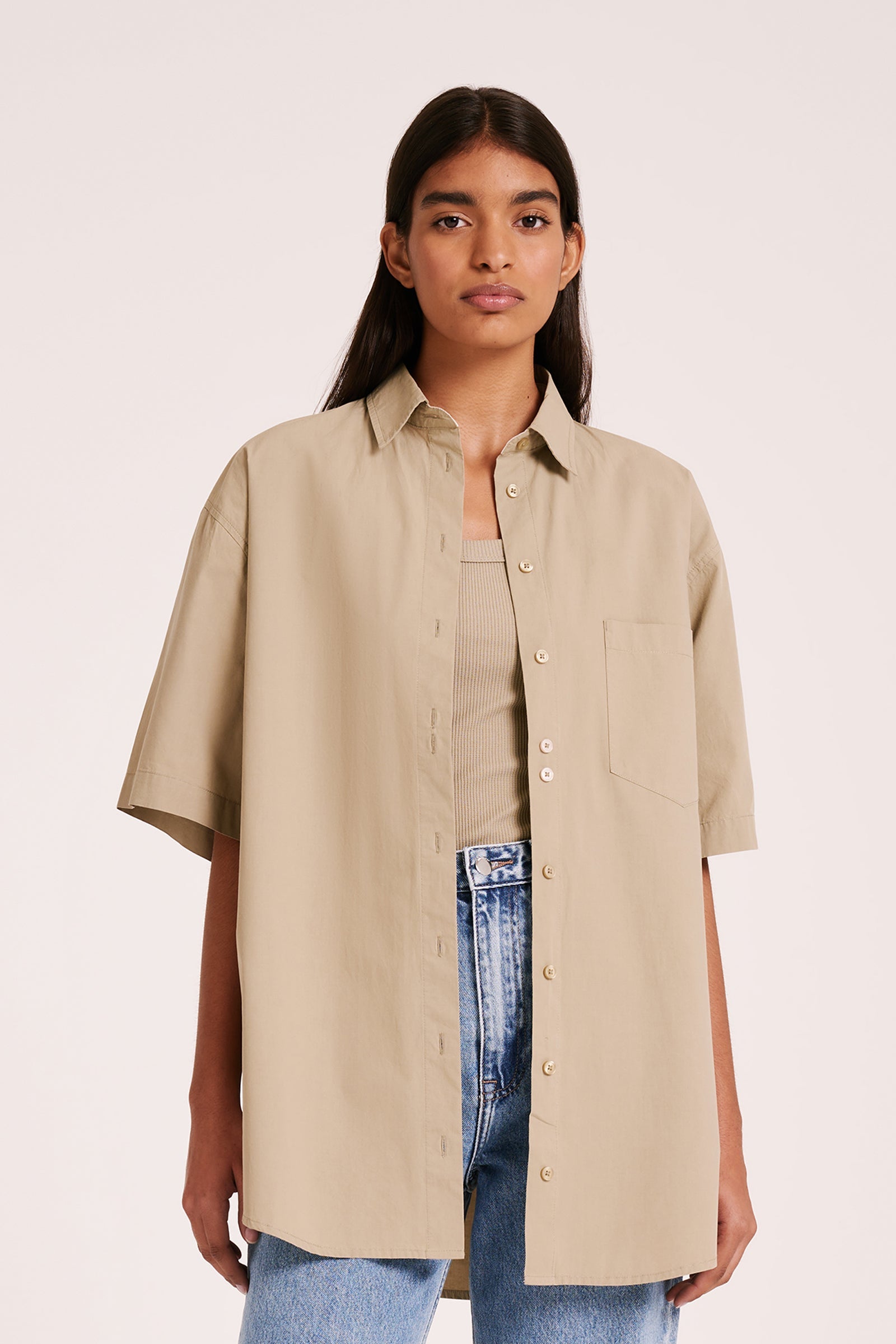The Leo Poplin Shirt in olive is made from our heavy weight cotton poplin which has a crisp hand feel. The silhouette is oversized with a drop shoulder and length finishing below the hips. Features include classic shirt details, contrast coloured button detail, contrast yoke seam and front patch pocket.