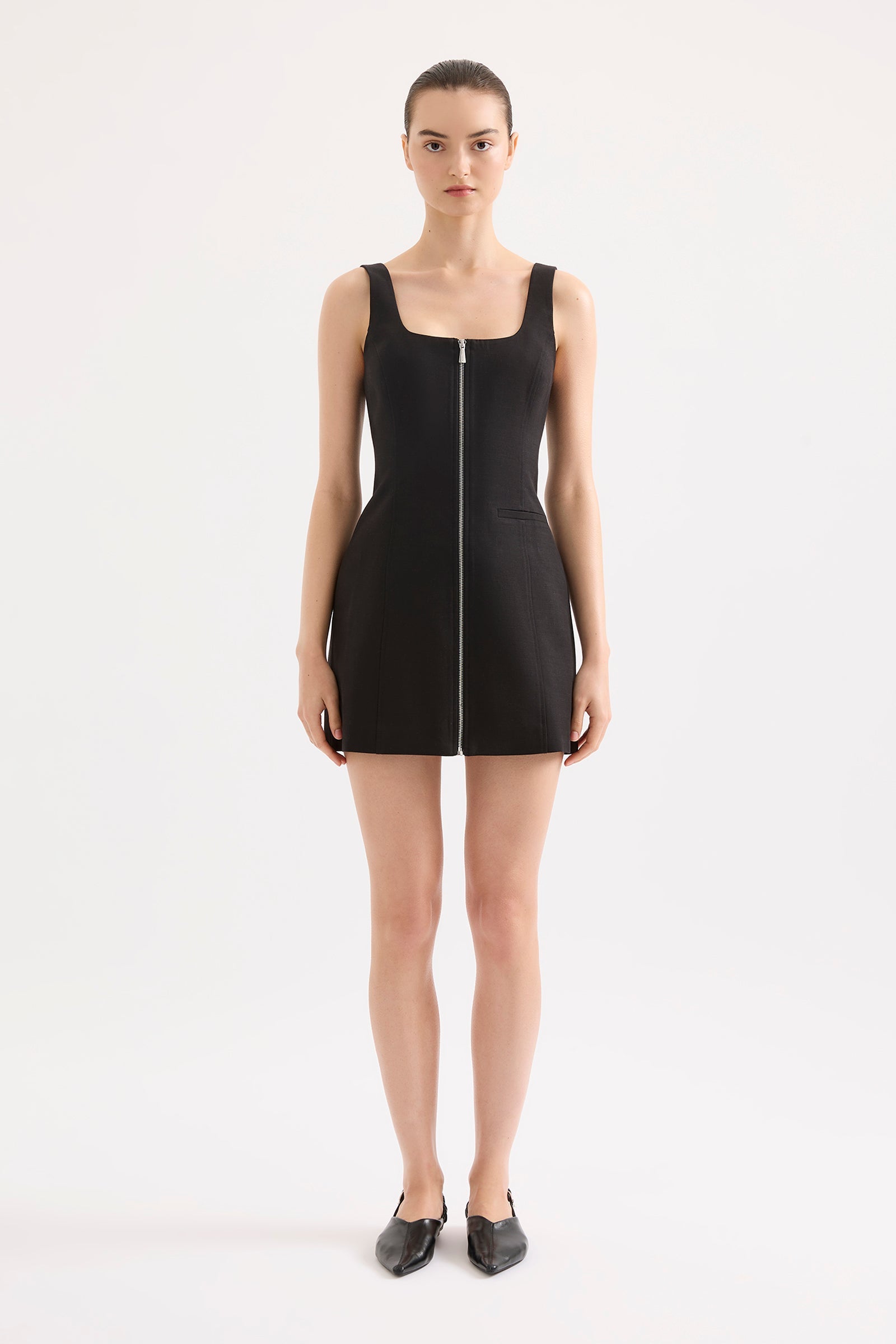 The Lina Mini Dress is made from a mid weight cotton Lyocell blend fabrication which has a soft, breathable hand feel and subtle texture. The silhouette is fitted at the bodice with an A line skirt that is mini in length. Features include panels to create shaping, faux pocket design detail and exposed branded zipper at centre front. This dress is fully lined.